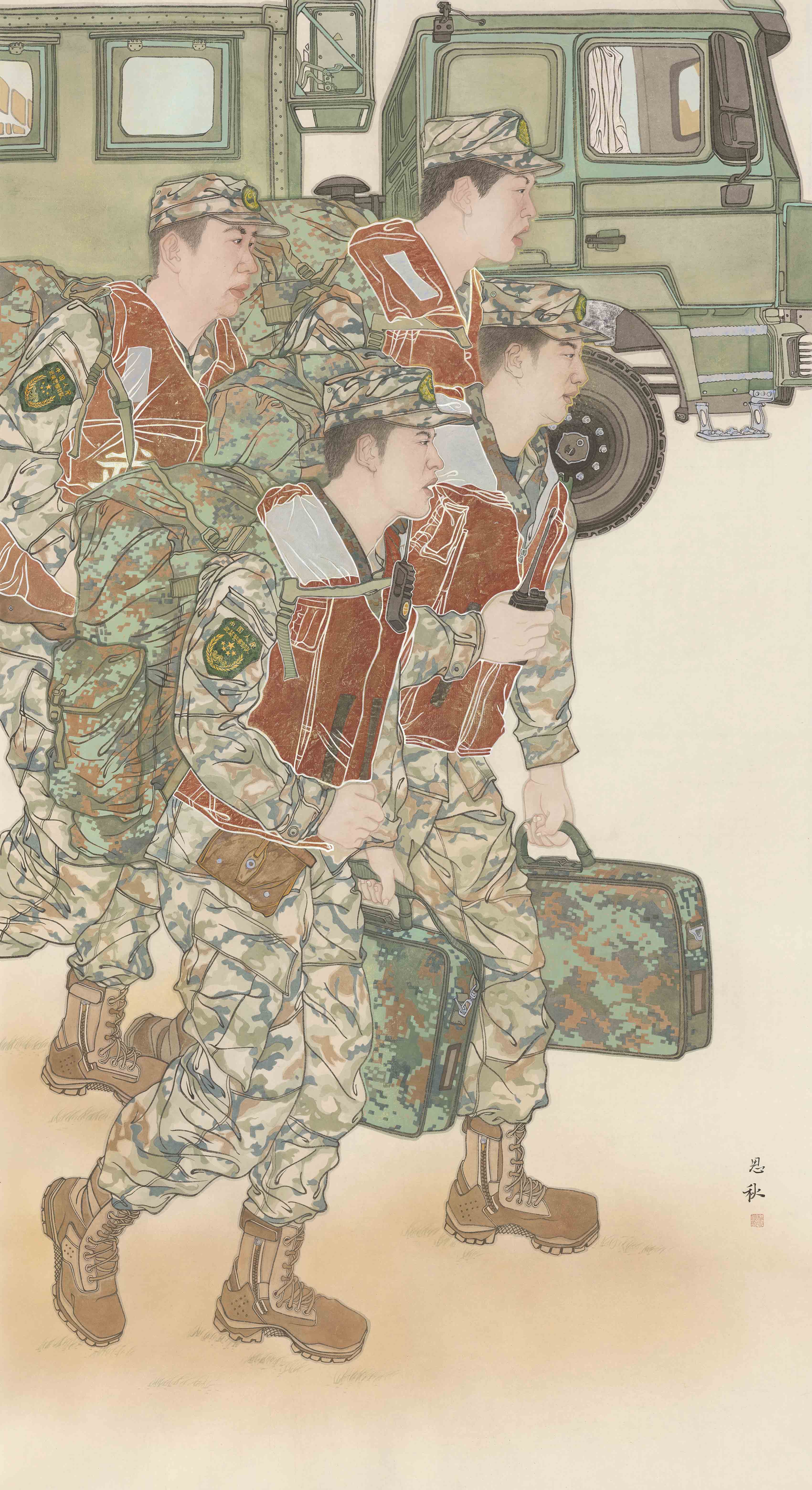 10月16日,由中华人民共和国文化和旅游部、重庆市人民政府、四川省人民政府、中国美术家协会共同主办的第十四届中国艺术节全国优秀美术作品展览在重庆开幕,我校美术与设计学院青年教师杜思秋中国画作品《守护》成功入展。该作品描绘了人民武警接令出征、奔赴一线、整装出发的瞬间,表达了人民武警是党和人民的忠诚卫士,是万家团圆、岁月静好的守护者,展示了中国军人的精、气、神。