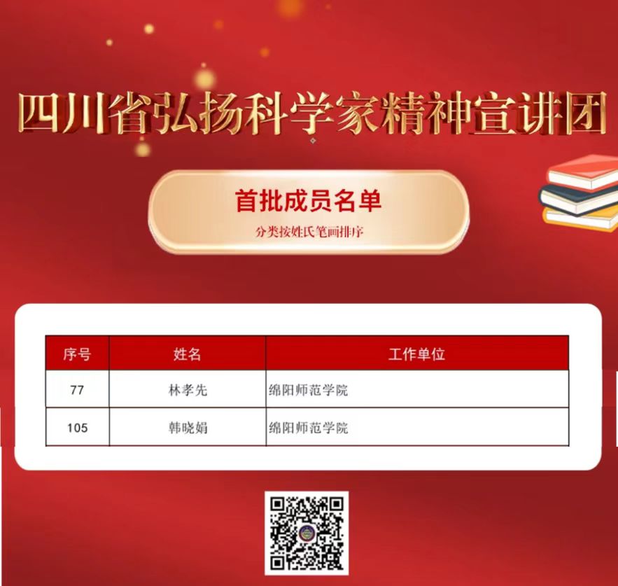 近日,四川省科学技术协会发布了四川省弘扬科学家精神宣讲团首批成员名单。首批宣讲团由两院院士、前沿专家、青年学者、基层科技工作者等117位成员共同组成。全国思政课名师工作室负责人韩晓娟、地理与环境学院“科普苔”团队负责人林孝先两位老师成功入选。