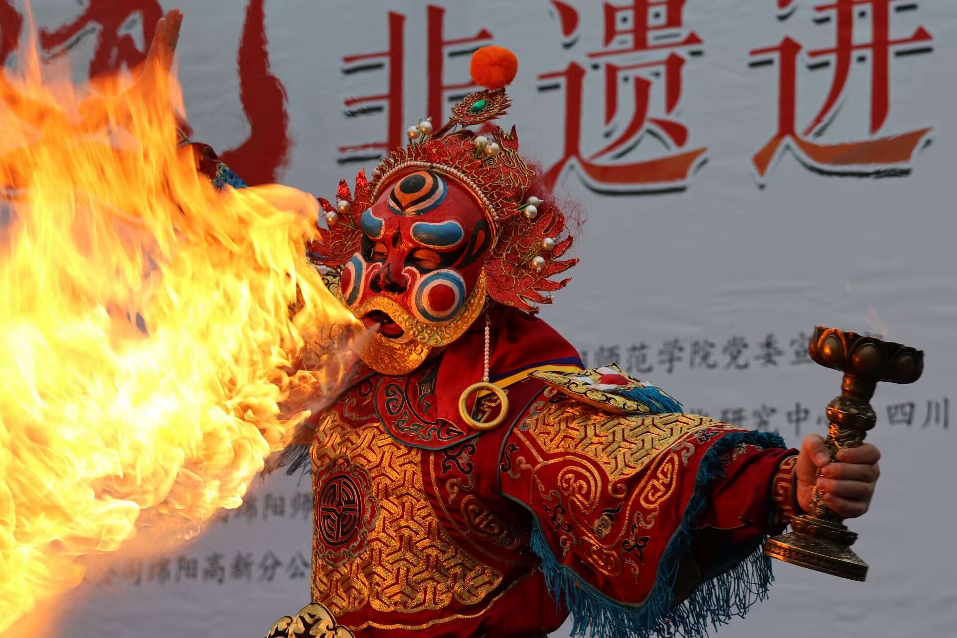 非遗传承表演是启动仪式上亮丽的风景。细密的雨丝斜斜织成幕帘,川剧变脸演员立于雨中,宽袖飞扬、一转一挥,脸谱在瞬息之间变换,引得观众连连喝彩。刹那间,橙红色的火焰猛地腾空而起,灼热的暖意瞬间驱散了秋雨带来的阵阵微凉。羌笛声也适时响起,悠扬婉转,穿透雨幕,仿佛远古的呼唤在耳畔回响。