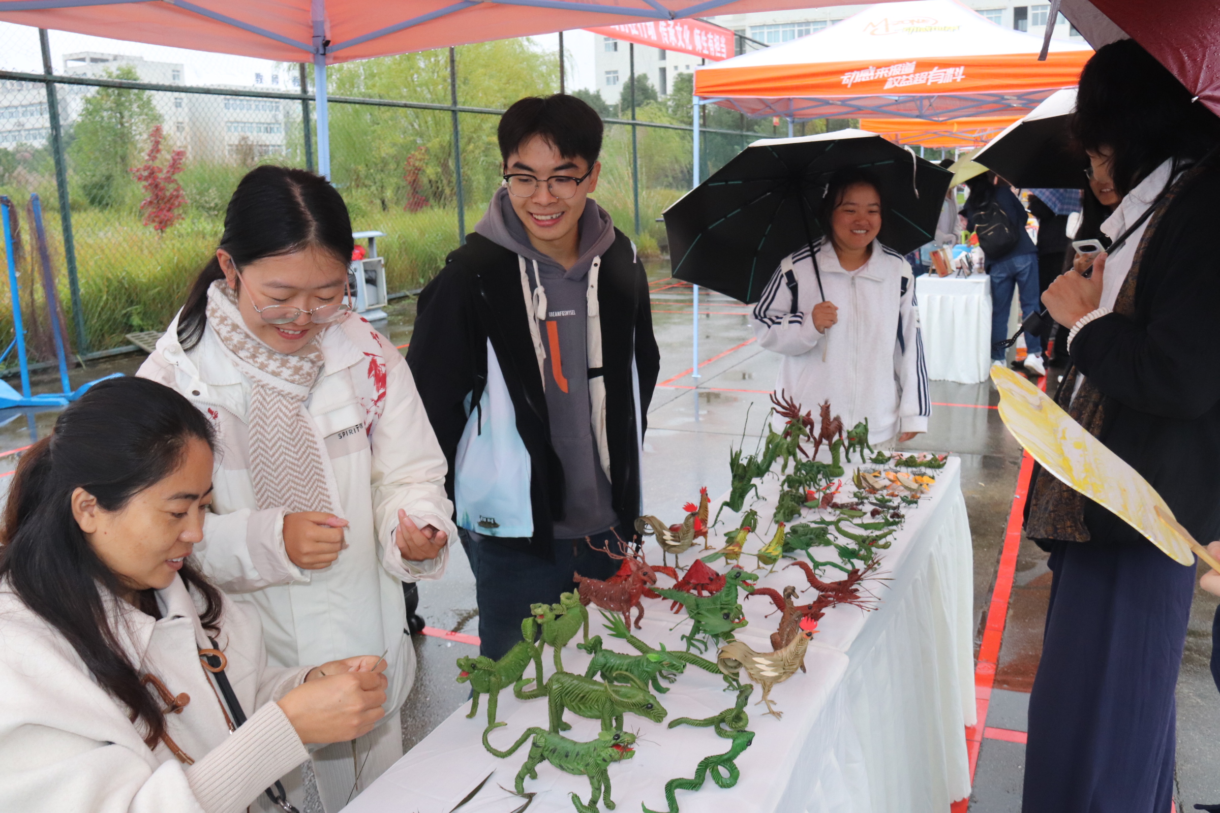 广场两侧,非遗项目展位有序陈列,成为师生互动体验的重要窗口。糖画摊位前,铜锅中的糖浆经小火慢熬,散发出诱人的甜香,吸引了众多同学驻足品尝。色彩明丽的羌绣作品前,同学们细致观察绣纹,不时以指尖轻抚,感受传统技艺的细腻与精湛。草编、绳结与泥塑等展区也围满了观众,非遗传承人不仅现场演示制作工艺,还深入讲解其背后的历史渊源。三台剪纸展位更是别出心裁,将人工智能与剪纸艺术创新融合——当静态的剪纸画面以动态形式呈现时,现场响起阵阵惊叹,展现出非遗技艺在当代的蓬勃活力。