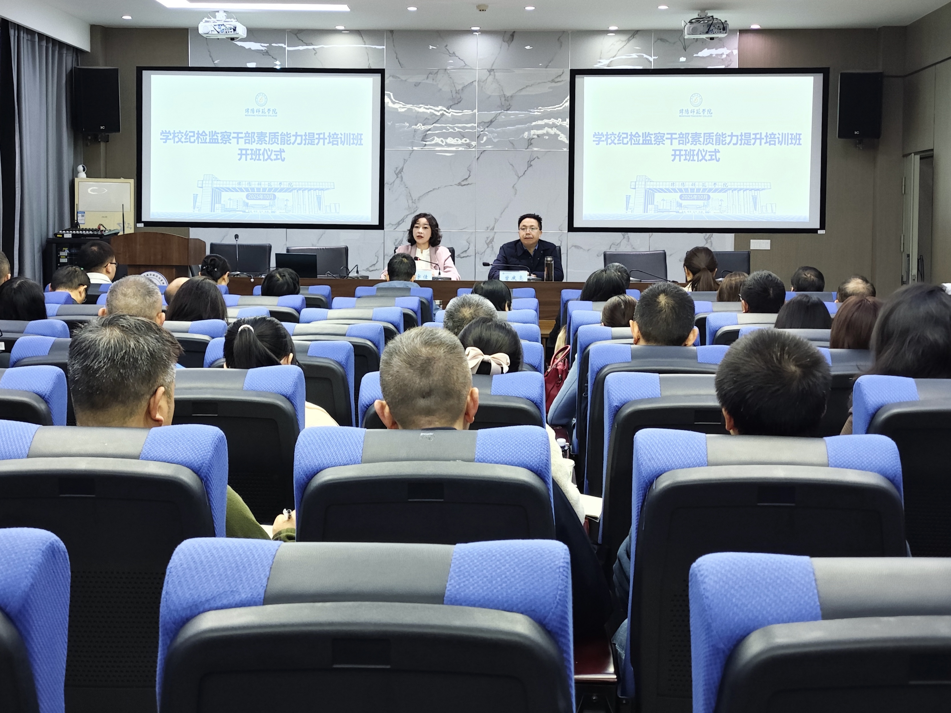 开班仪式上,驻校纪检监察组组长、校党委副书记、纪委书记曾庆亮作开班动员讲话,他深刻阐述了纪检监察干部队伍建设面临的新形势、新挑战,对全体学员提出三点要求。一是坚持政治导向,提高政治站位,深刻认识纪检监察干部培训的重要意义。全体学员要从全面从严治党和落实立德树人根本任务上深化思想认识,增强政治自觉,把思想和行动统一到党中央的决策部署上来。二是坚持问题导向,立足主责主业,锤炼过硬履职本领。全体学员要从自身履职本领出发查找短板、补齐弱项,从工作对象出发精准发现、高效解决问题。三是坚持效果导向,扎实工作作风,推动各项任务落地落实。全体学员要持续巩固拓展深入贯彻中央八项规定精神学习教育成果,以训促学、以学促干,深入系统学、联系实际学,将纪检监察工作与教育教学、日常管理等工作同谋划、同部署、同落实、同考核。