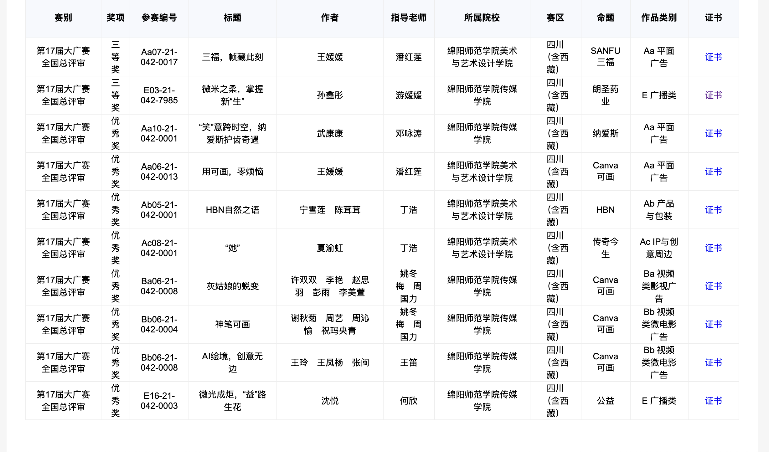 近日,第十四届全国大学生广告艺术大赛(简称“大广赛”)评审结果陆续揭晓。学校传媒学院学子凭借出色的创意与扎实的专业能力,在比赛中表现卓越,捷报频传,荣获国家级三等奖1项、优秀奖5项,省级一等奖8项、二等奖24项、三等奖38项及优秀奖多项。获奖数量与质量均创历史新高,实现了在该项顶级赛事中的全新突破。