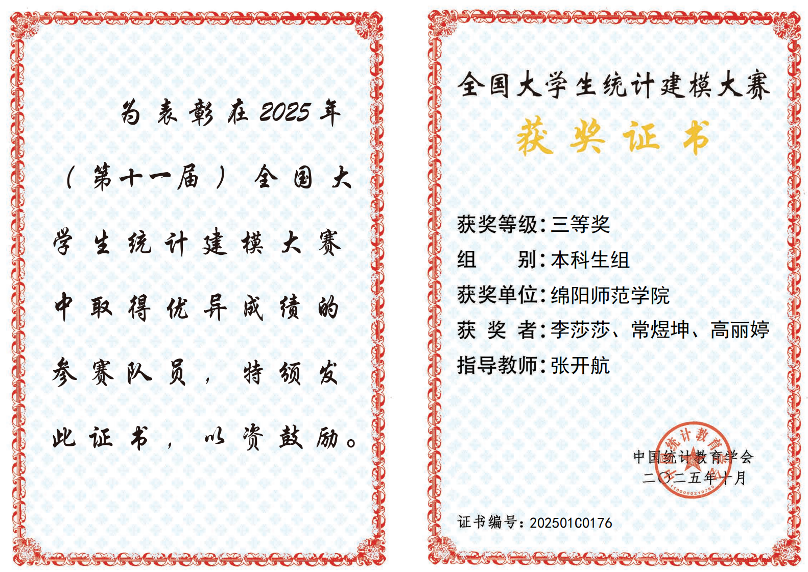 近日,2025年(第十一届)全国大学生统计建模大赛国赛落下帷幕,我校选派的两支参赛队伍凭借扎实的专业功底、创新的模型构建,双双荣获全国三等奖,取得了我校在该项国家级赛事中的历史性突破。充分彰显了我校在创新人才培养和跨学科实践教学方面的卓越成果。