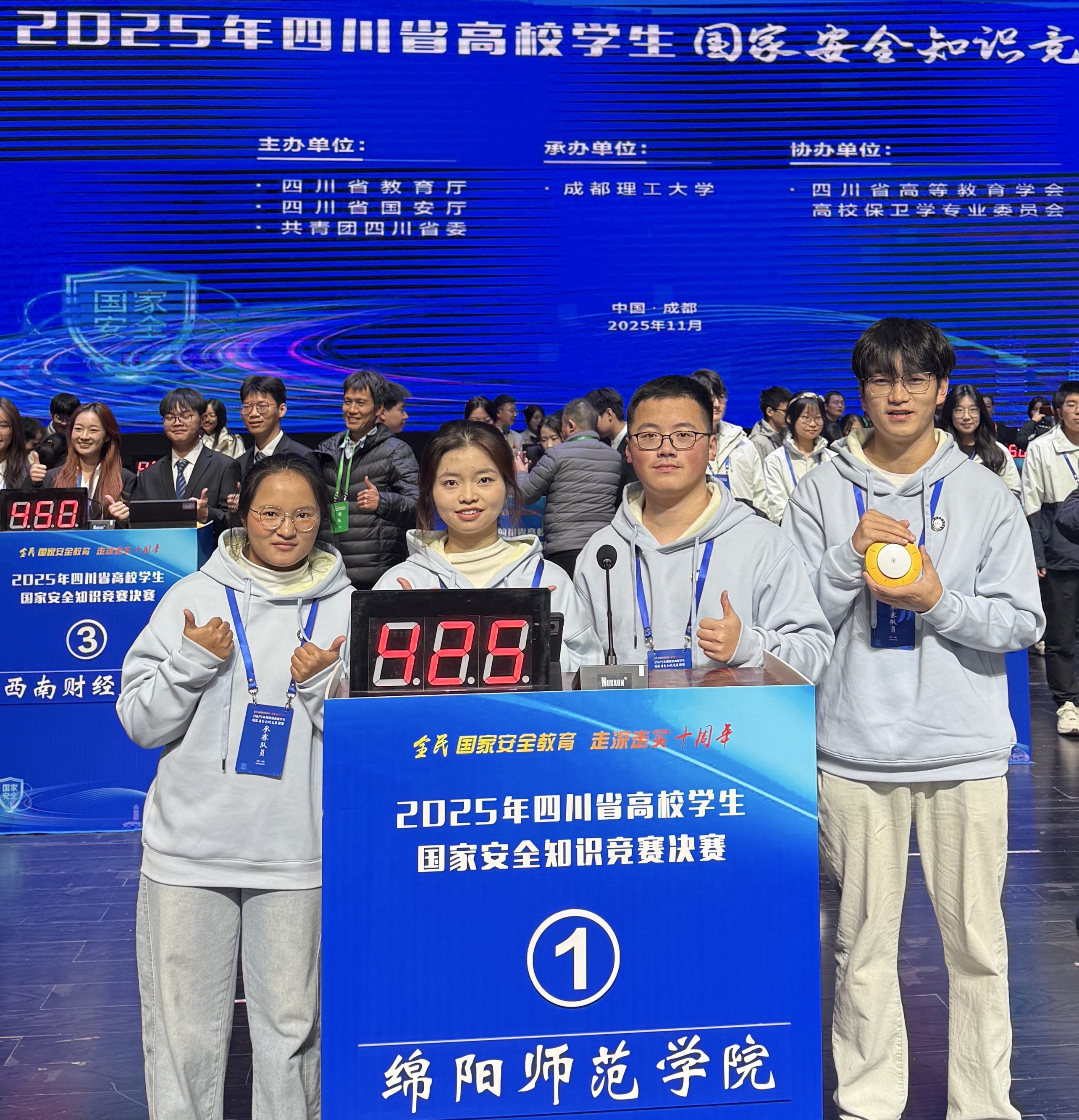11月19日,由四川省教育厅、国安厅及共青团四川省委共同主办的“四川省高校学生国家安全知识竞赛决赛”在成都理工大学(二仙桥校区)举行。学校代表队凭借出色成绩入围决赛现场,与来自全省15所高校的队伍激烈比拼,荣获大赛三等奖。
