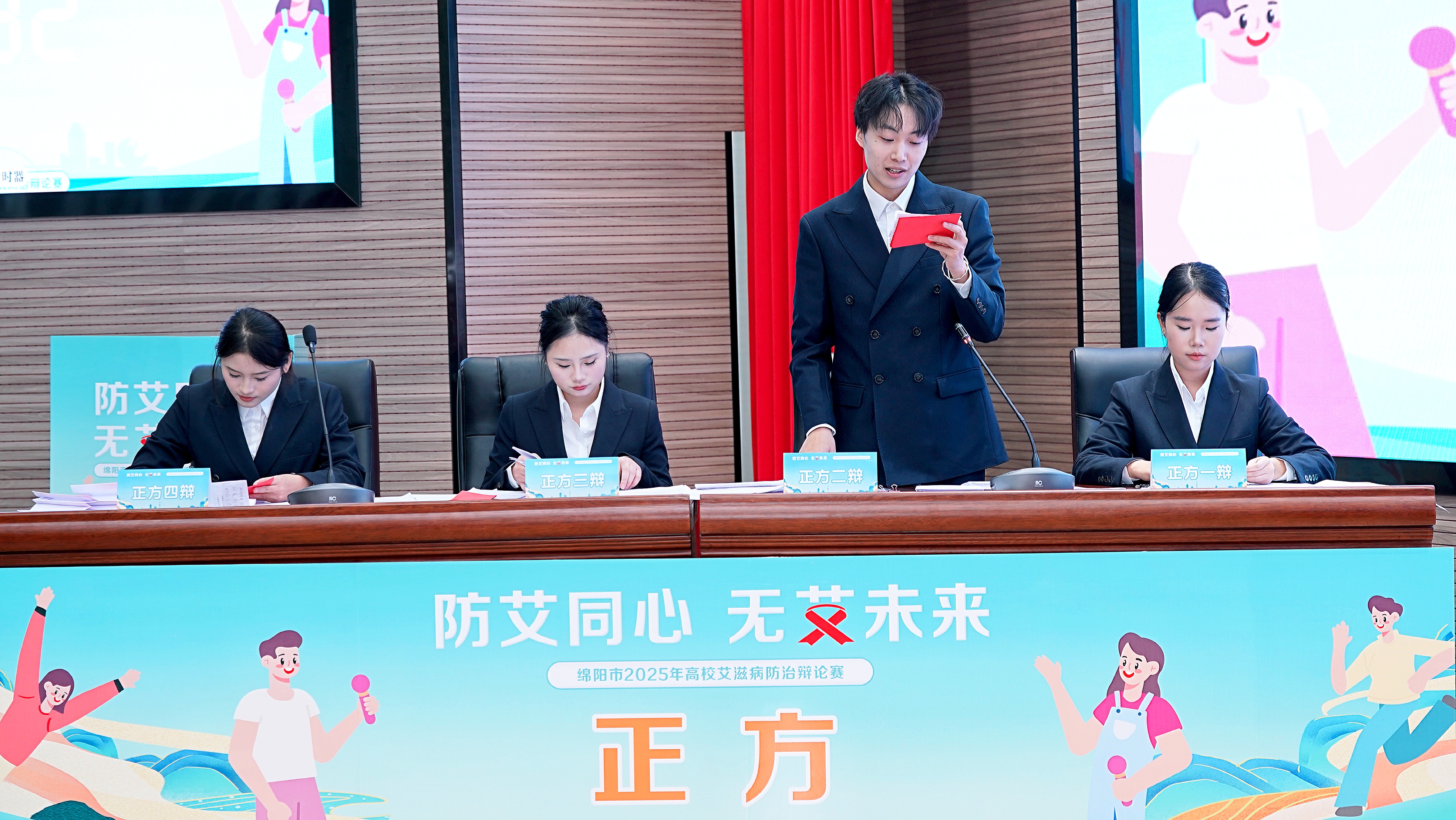 11月20日,“防艾同心·无艾未来”高校艾滋病防治辩论赛在学校高新校区举办。绵阳师范学院、西南财经大学天府学院、四川中医药高等专科学校、绵阳职业技术学院4所高校代表队,以思想交锋筑牢防艾防线,用青春之声传递健康理念。青年健康是实施健康中国战略的重要内容,防艾教育是重要抓手之一。本次比赛聚焦高校防艾核心路径、自我防护与社会包容等辩题,直击青年群体关注的防艾痛点,具有较好的现实意义与思辨价值。