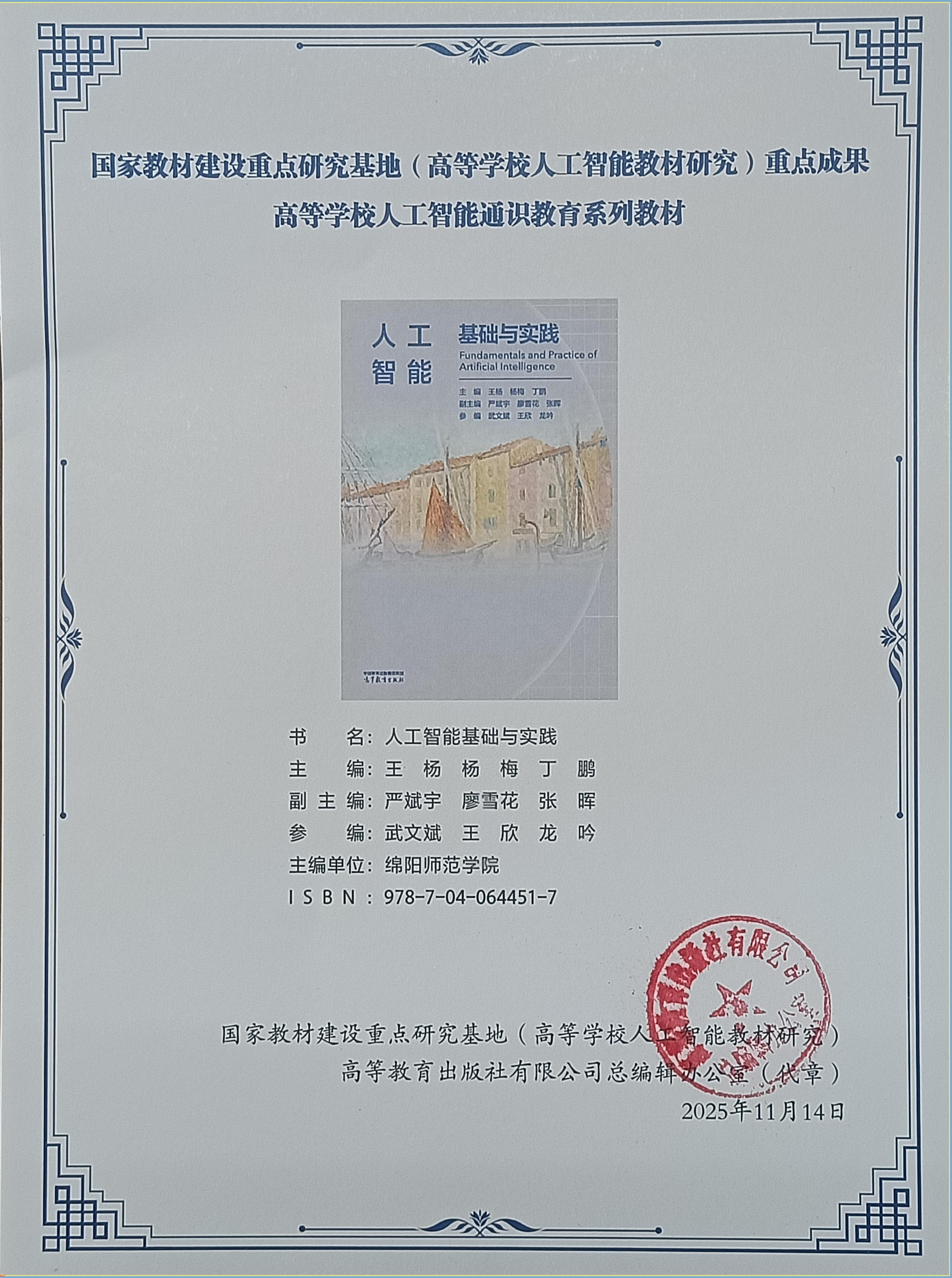 11月22日,学校副校长王杨编写的教材《人工智能基础与实践》在杭州举办的“2025 新时代高校计算机教学改革与创新交流会・高校人工智能教育教学创新协作机制年会”上,作为国家教材建设重点研究基地(高等学校人工智能教材研究)重点成果,入选高等学校人工智能通识教育系列教材并参与发布仪式;在福州召开的“2025亚太人工智能教育大会”颁奖典礼上,该教材凭借优质的内容编排与实践价值,获评“2025亚太人工智能教育教材一等奖”。