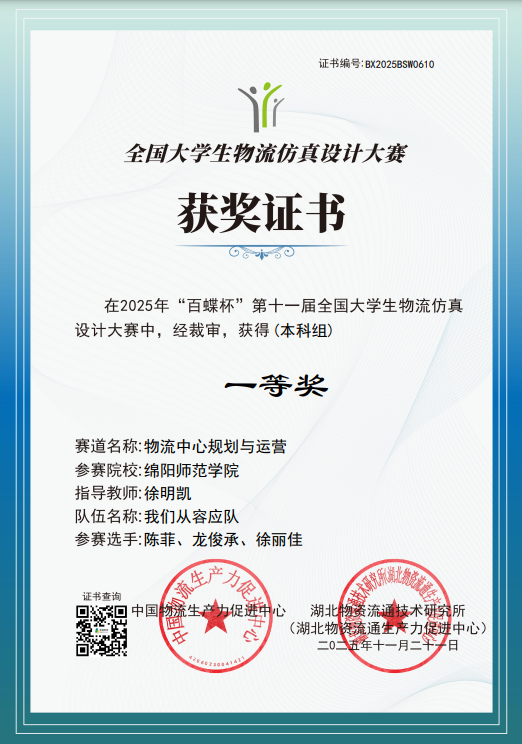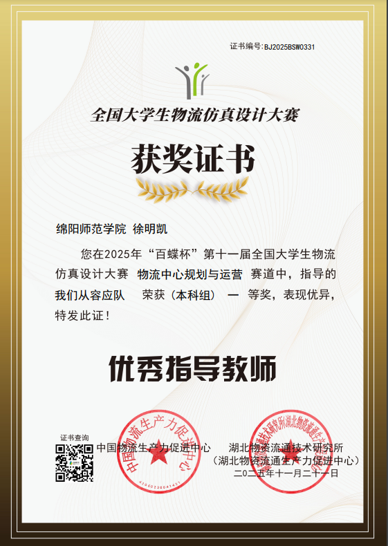 近日,由中国物流生产力促进中心主办的“第十一届全国大学生物流仿真设计大赛”公布了获奖结果。学校数字经济与管理学院学子获全国一等奖1项,三等奖1项;徐明凯获“优秀指导老师”奖。