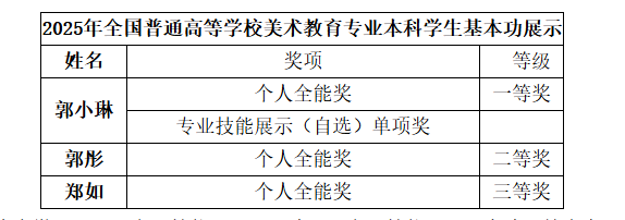 学校在此次基本功展示活动中取得优异成绩。学校美术与设计学院2022级美术学专业学生郭小琳、郭彤、郑如组成的展示团队,凭借扎实的专业素养与稳定的现场发挥,郭小琳斩获全国个人全能一等奖,郭彤和郑如分别获得全国个人全能二等奖和三等奖,此外,郭小琳还收获专业技能展示(自选)单项奖,学校以全国第八名的成绩荣获团体二等奖,实现历史性突破。