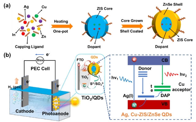图1. (a)银和铜双掺杂ZIS/ZnSe量子点合成示意图, (b)量子点-TiO2异质结PEC电池原理图