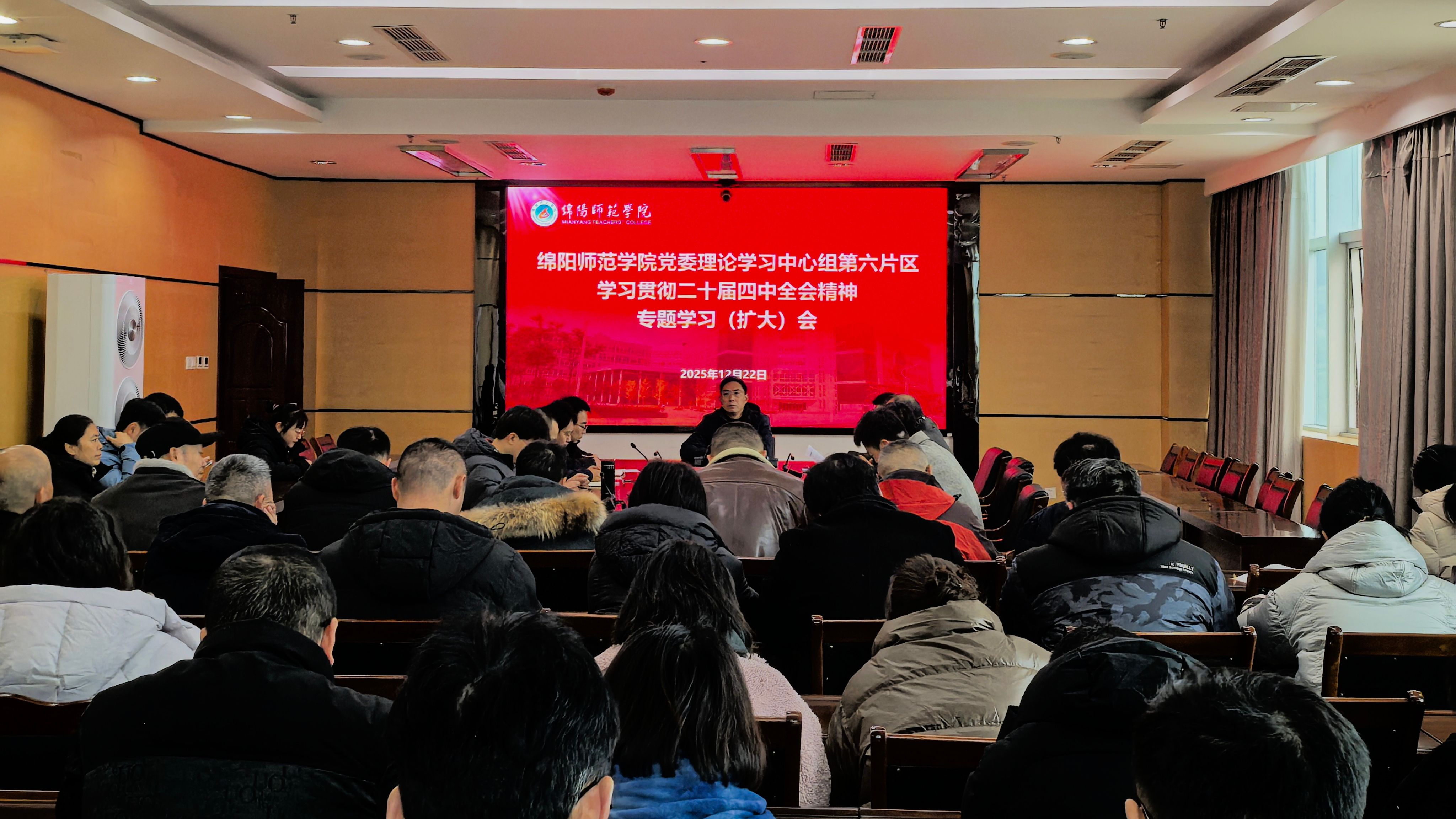 12月22日,学校党委理论学习中心组第六片区学习贯彻党的二十届四中全会精神专题学习(扩大)会在知行楼612召开。学校党委常委、副校长蒋伟出席会议并作专题辅导报告,后勤服务处敬海波主持会议。计划财务处、基建处、后勤服务处、资产经营公司、音乐与舞蹈学院、体育学院、美术与设计学院的科级以上干部、专业负责人、教研室主任、各党支部书记参加学习,党外领导干部列席会议。