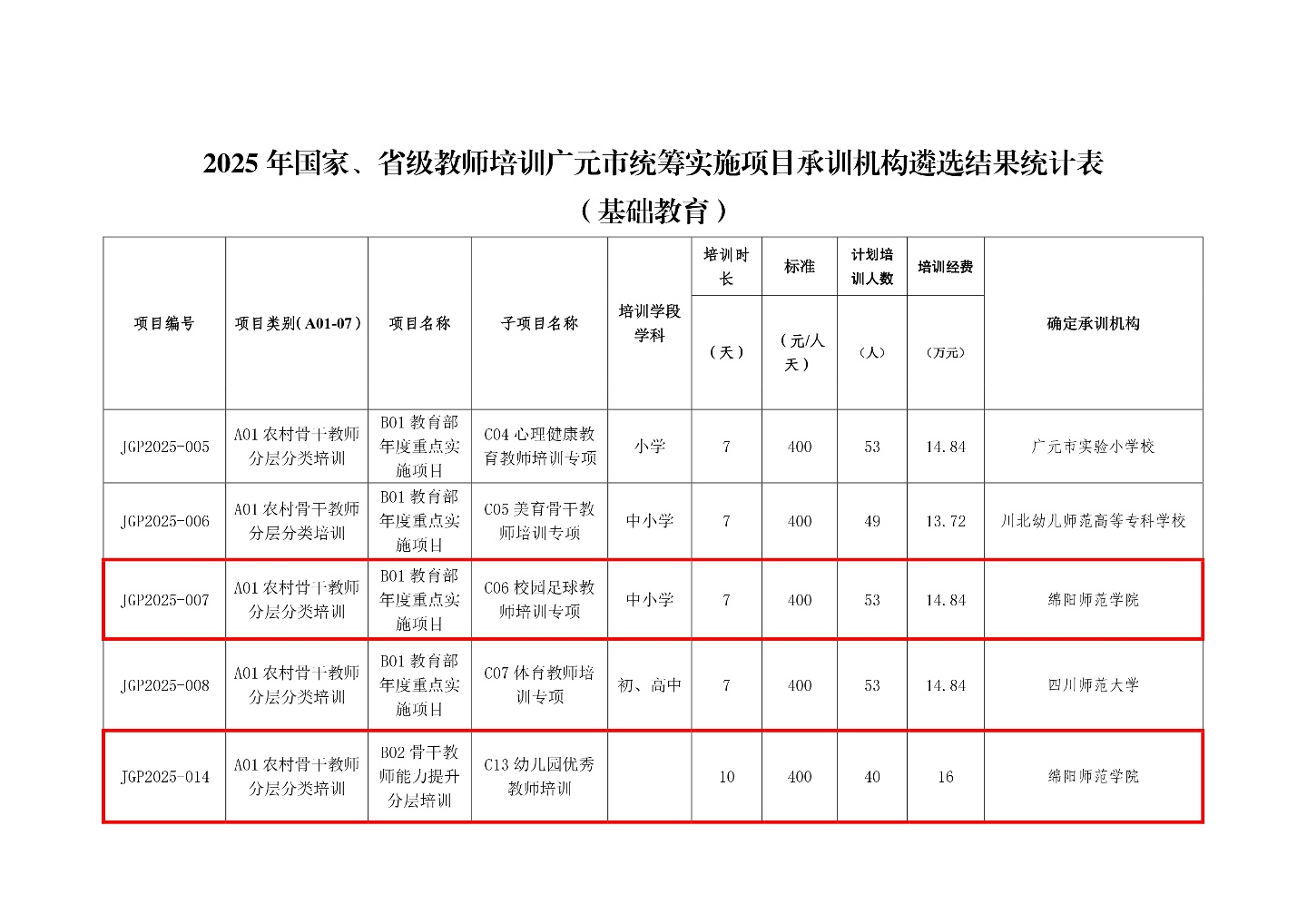 近日,广元市教育局发布了《关于2025年国家、省级教师培训广元市统筹实施项目承训机构遴选结果的公示》,学校成功中标两个重点项目,分别为“校园足球教师培训专项”(体育学院申报)和“幼儿园优秀教师培训”(教育学院申报)。