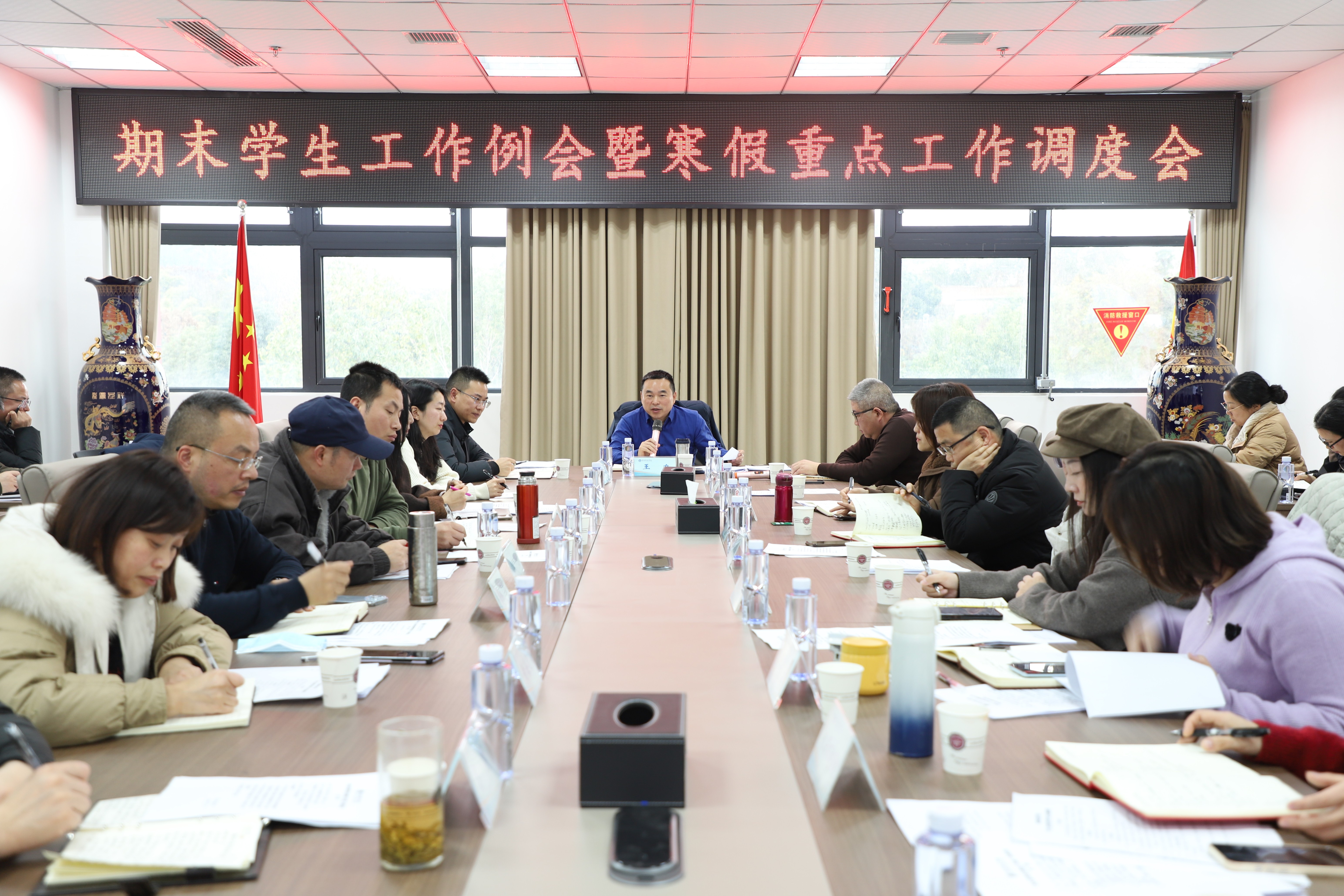 会上,学工部、校团委、保卫处、心理与社会学院等负责人分别通报了2025年学生工作考核情况、学生满意度测评、辅导员工作成果、考研专项奖励、2026届毕业生考研报考、入学教育、安全教育、心理健康教育等工作情况,并就期末及寒假期间的学生诚信考试教育、离校安全教育、劳动教育实践、学生工作特色展示、学生寒假去向登记及留校学生审批管理、校外住宿学生管理、考研学生初试跟踪与复试帮扶、学生公寓离校管理、寒假资助育人、“双创”赛、团代会、大学生艺术展、学生心理健康教育等重点工作进行了安排和部署。