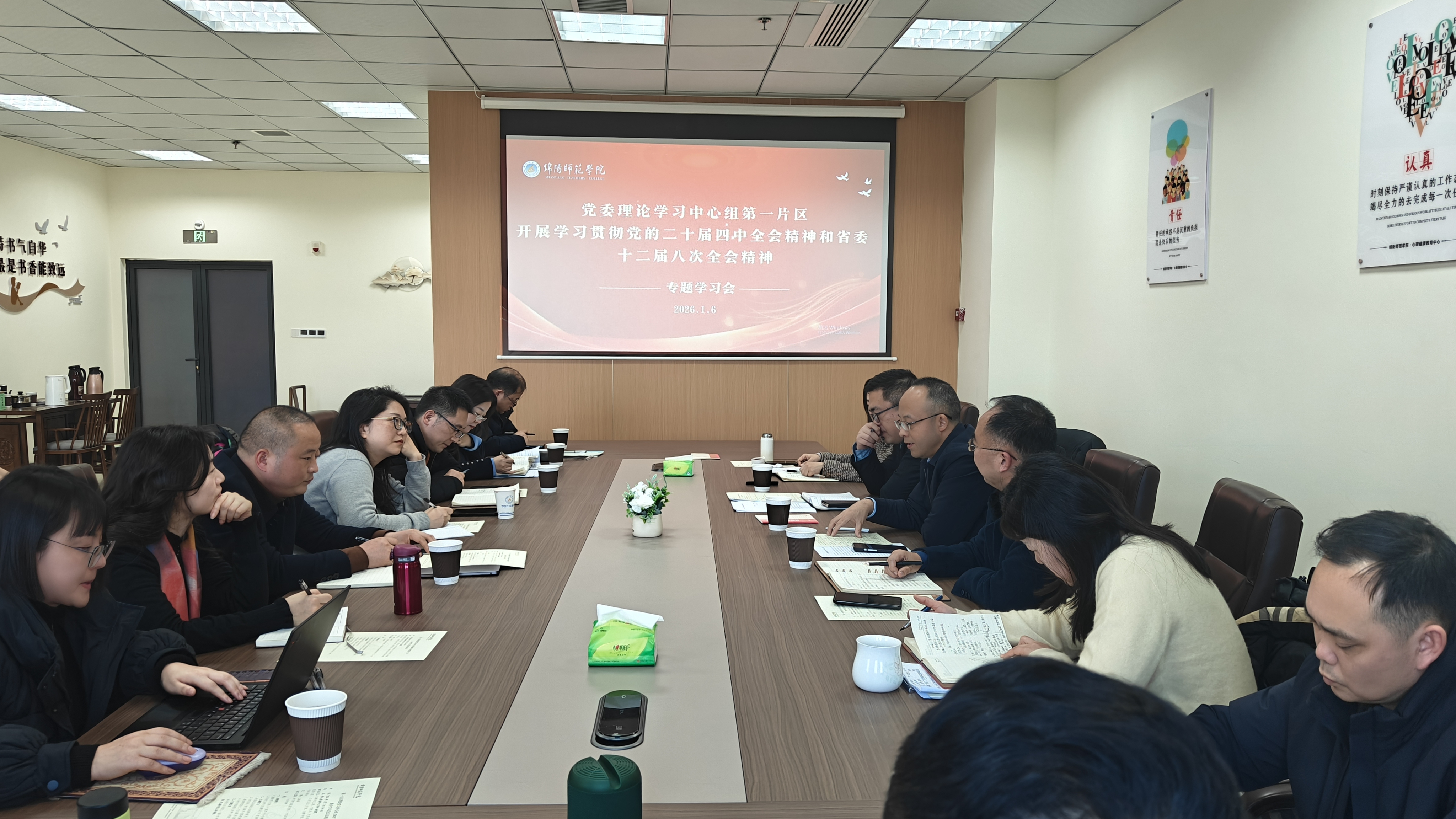 1月7日下午,党委理论学习中心组第一片区在学生活动中心304室召开党的二十届四中全会和省委十二届八次全会精神专题学习会。党委巡察办(机关党委、目督办)、马克思主义学院、教育学院和心理与社会学院等全体处级干部参会,学校党委书记陈寒出席并点评。会议由心理与社会学院党委负责人主持。