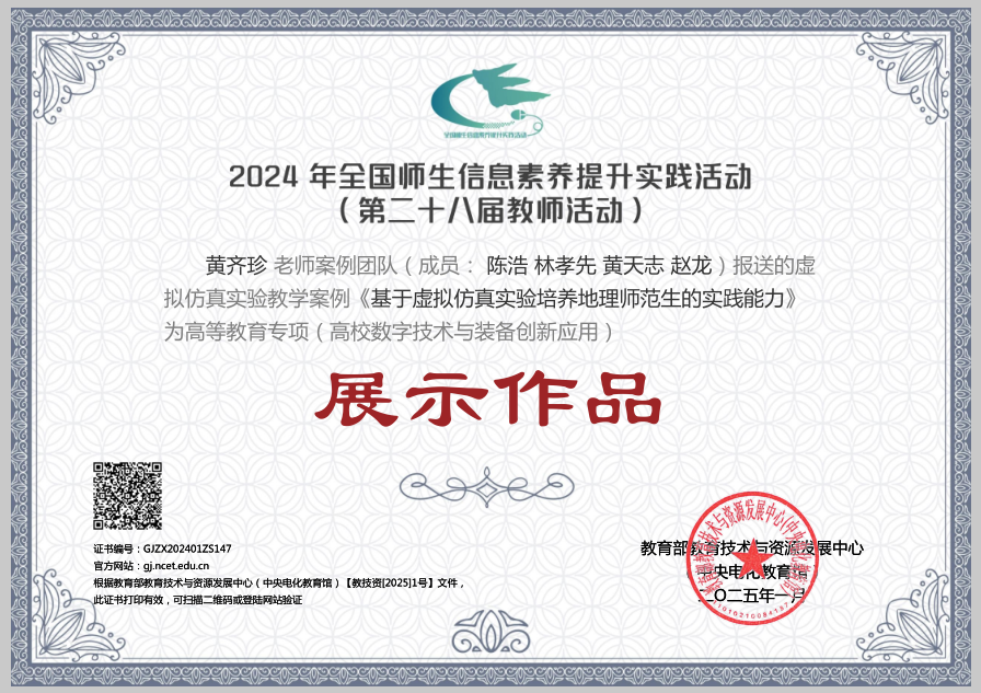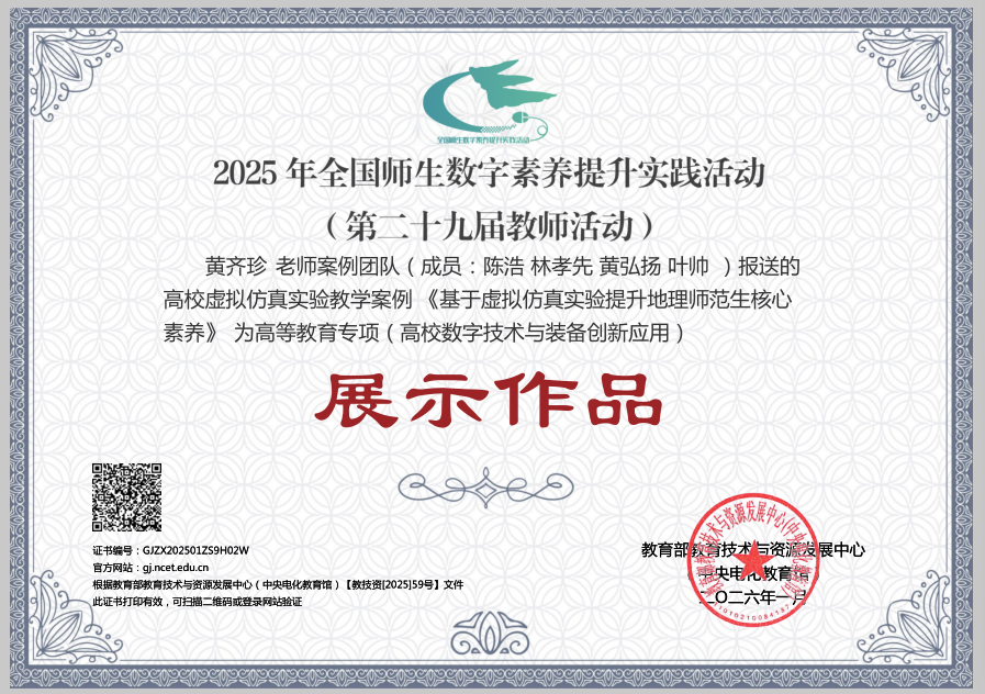连续两年入选教育部展示作品,是教育部对学院虚拟仿真创新教学改革成果的充分认可,也彰显了学院在地理教师教育领域的扎实积累与创新探索。近年来,学院始终坚持以师范生培养质量为核心,不断推进虚拟仿真技术与地理教育教学的深度融合,持续优化教学资源建设,完善实践教学体系,为提升师范生培养质量提供了有力支撑。