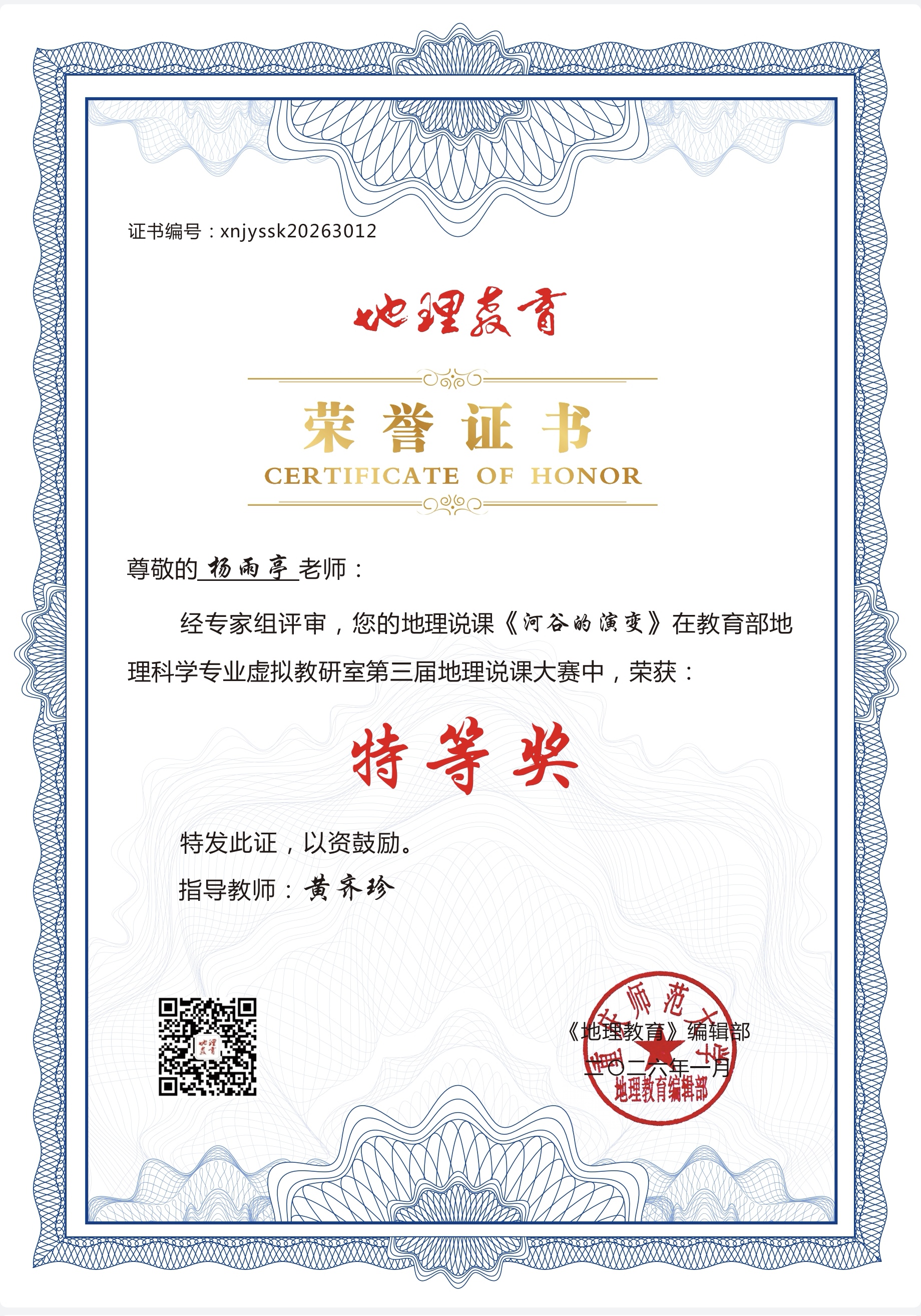 在本次赛事中,郑雨欣同学的说课作品《V型谷的演变》、杨雨亭同学的说课作品《河谷的演变》,凭借新颖的教学设计、清晰的逻辑架构与生动的课堂呈现,从海量参赛作品中脱颖而出,双双斩获特等奖;李金帅同学的说课作品《海陆的变迁》凭借扎实的专业功底与出色的教学表达,荣获一等奖。三项荣誉的取得,离不开黄齐珍老师的悉心指导,更凝聚着参赛同学的不懈打磨与专业积累。
