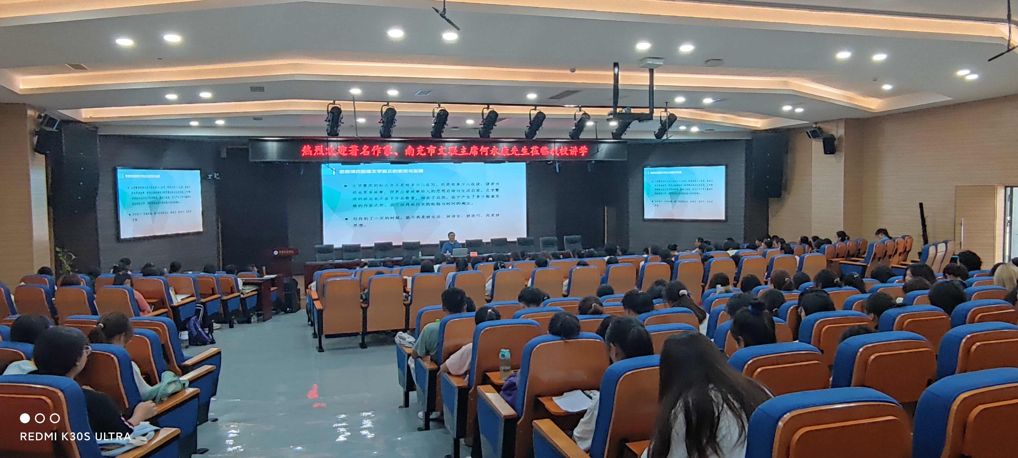 9月23日下午,著名作家、南充市文联主席何永康先生应邀在我校厚德楼A246学术报告厅举行了题为《文学:思想的博弈》专场讲座。讲座由校宣传部、科技处主办,图书馆、文学与历史学院共同承办,图书馆相关负责人以及文学与历史学院学生300多人参加。