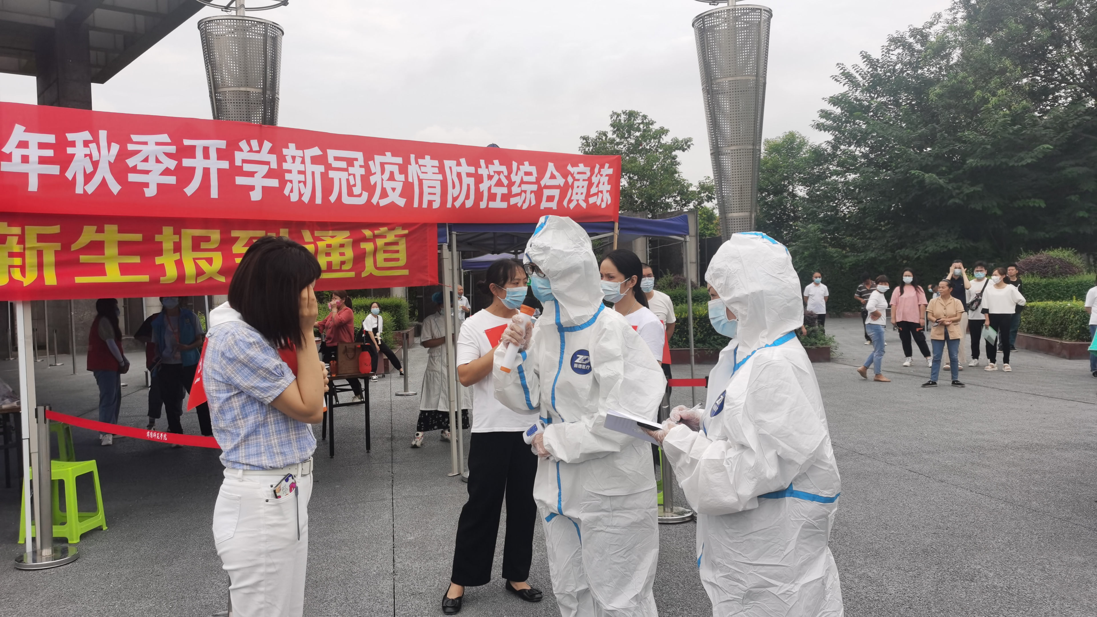 本次演练主要包括2021年秋季学期学生入学流程演练和疫情防控案例演练。入学流程演练涵盖了从入校通道设置、人车分流引导、第一次测温消毒、二次测温、返校资料审查、核酸检测等环节。在案例演练中,公寓管理员接到报告后,立即到达学生寝室进行测温登记,测得学生体温为38.2°,在为其做好防护和就地隔离后,管理员即刻通知卫生科值班医生,并立即封锁公寓楼栋,同时向后勤处、学工部、保卫处和学生所在院系相关负责人报告。医生到达现场开展测温及流行病学史调查,并通知定点医院开展接诊排查处置,等待定点医院根据排查结果进行下一步处理......