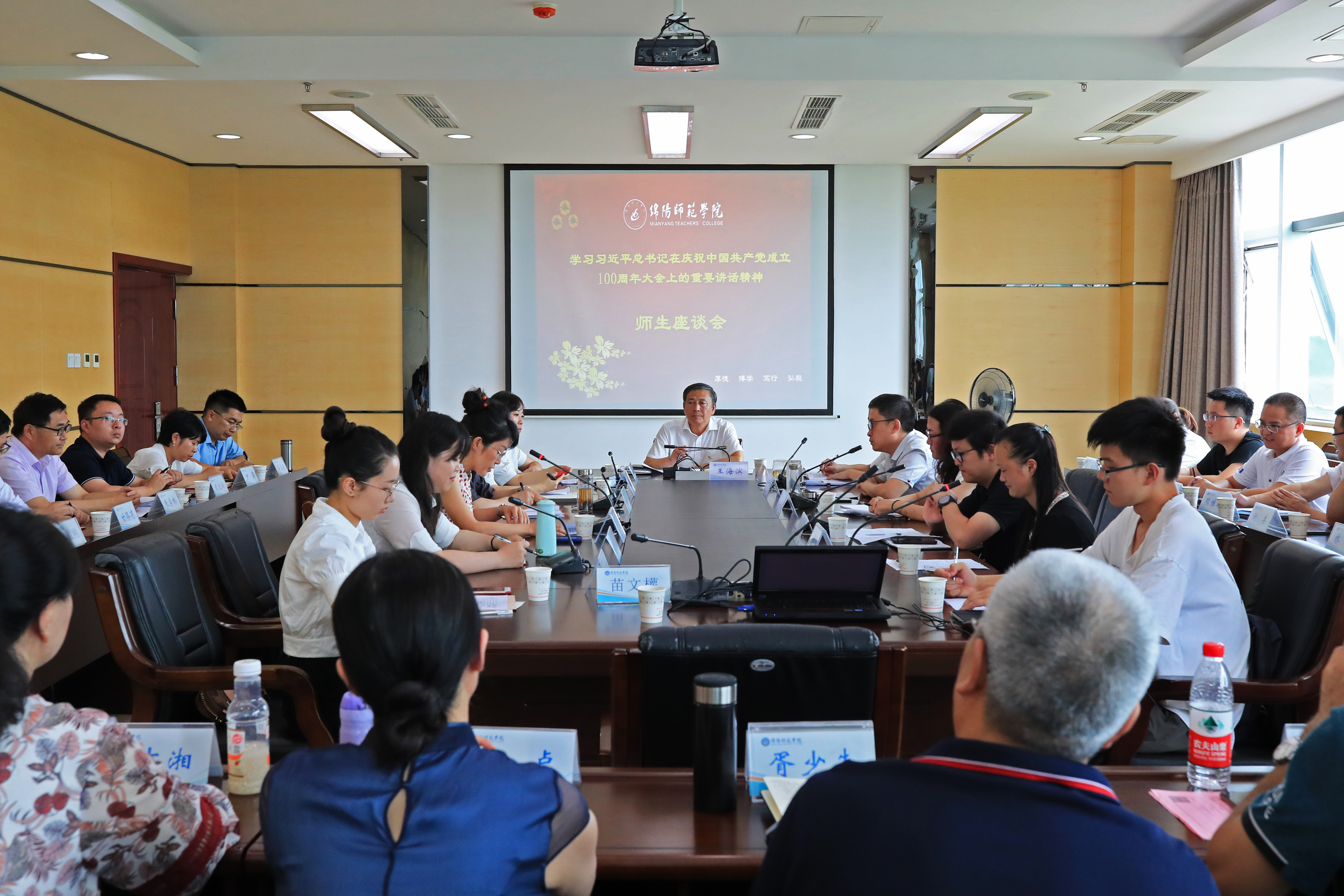7月1日下午,学校召开师生座谈会,专题学习习近平总书记在庆祝中国共产党成立100周年大会上的重要讲话精神。党委书记王海滨与二级单位教职工代表、各学院学生代表等在会上共话学习感悟。会议由党委宣传部负责人主持。