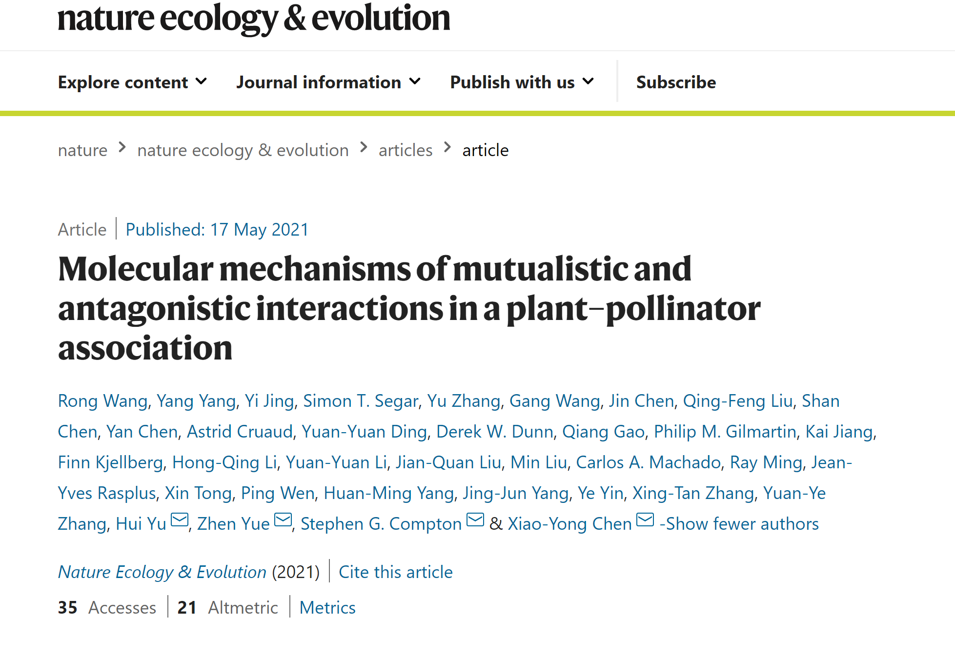 5月17日,Nature Ecology & Evolution在线发表了题为“Molecular mechanisms of mutualistic and antagonistic interactions in a plant–pollinator association”的研究成果。以榕属植物薜荔(Ficus pumila)及其专性传粉者薜荔榕小蜂(Wiebesia pumilae)为对象,通过组装两个物种的高质量基因组并结合多组学分析方法,首次确定了传粉小蜂识别宿主榕属植物以及幼虫适应宿主化学防御的分子机制。