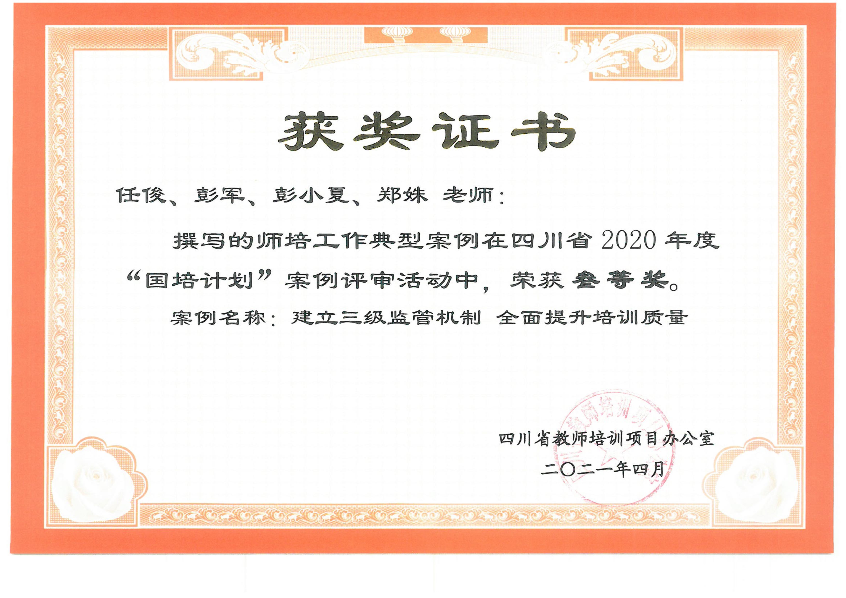 近日,四川省教师培训项目办公室印发《四川省教师培训项目办公室关于2020年度“国培计划”项目典型工作案例评审结果的通知》,通报了全省2020年各市(州)项目县和相关承训单位报送的“国培”项目典型工作案例的评审结果,我校在此次评审中喜获佳绩。