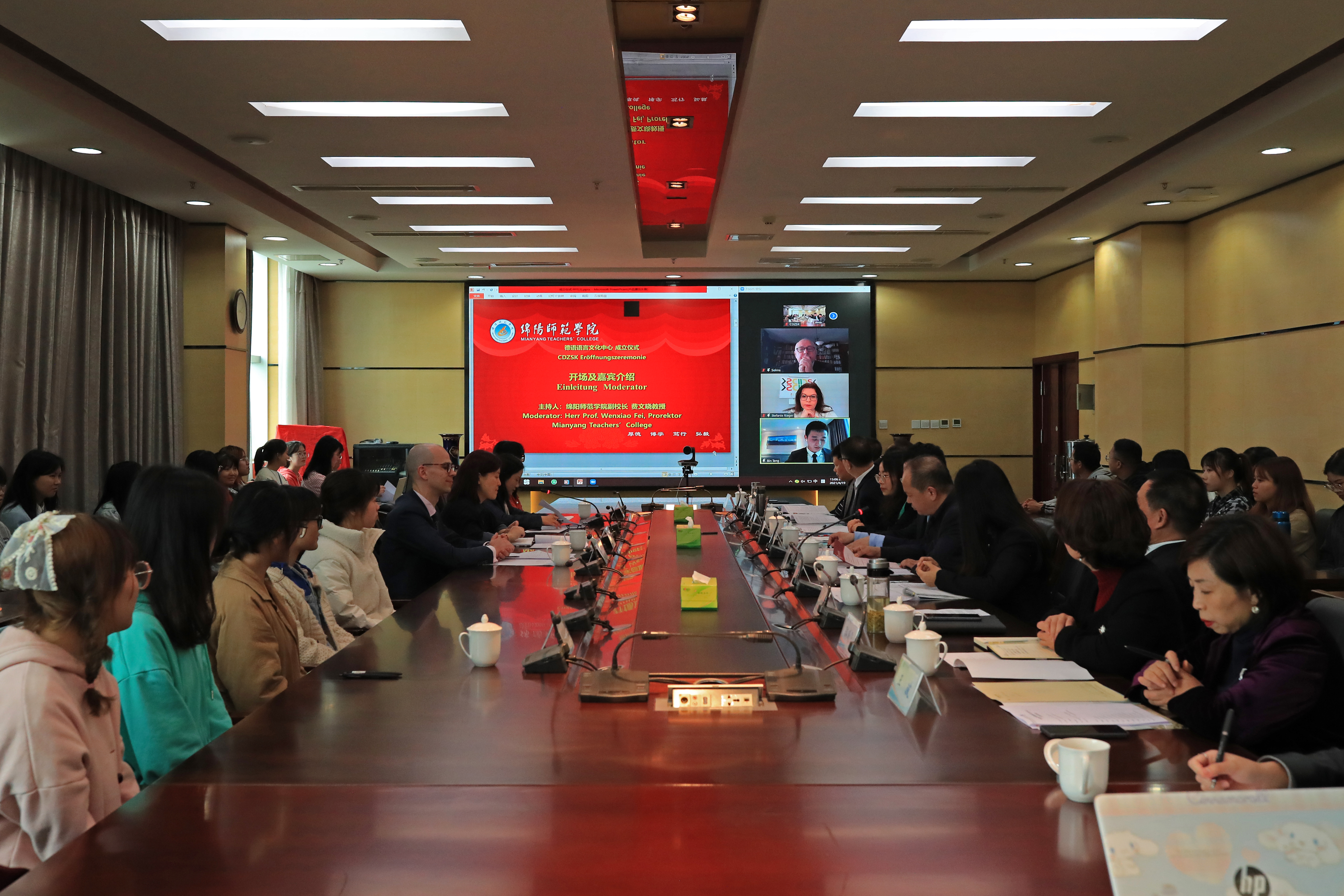 4月19日, “德语语言文化中心”成立仪式在学校高新校区知行楼514会议室举行。该中心的成立开启了学校与德国马丁·路德·哈勒维滕贝格大学深化合作的新征程。德国驻成都总领事馆副总领事邓森(Sebastian Dern),绵阳市外事办公室副主任赵莉、绵阳市委教育工委副书记周时光 、绵阳市对外友好协会副会长李军,学校校长李树勇出席了仪式,学校国交处、外国语学院负责人及德语专业师生代表参加了仪式。仪式由学校党委常委、副校长费文晓主持。