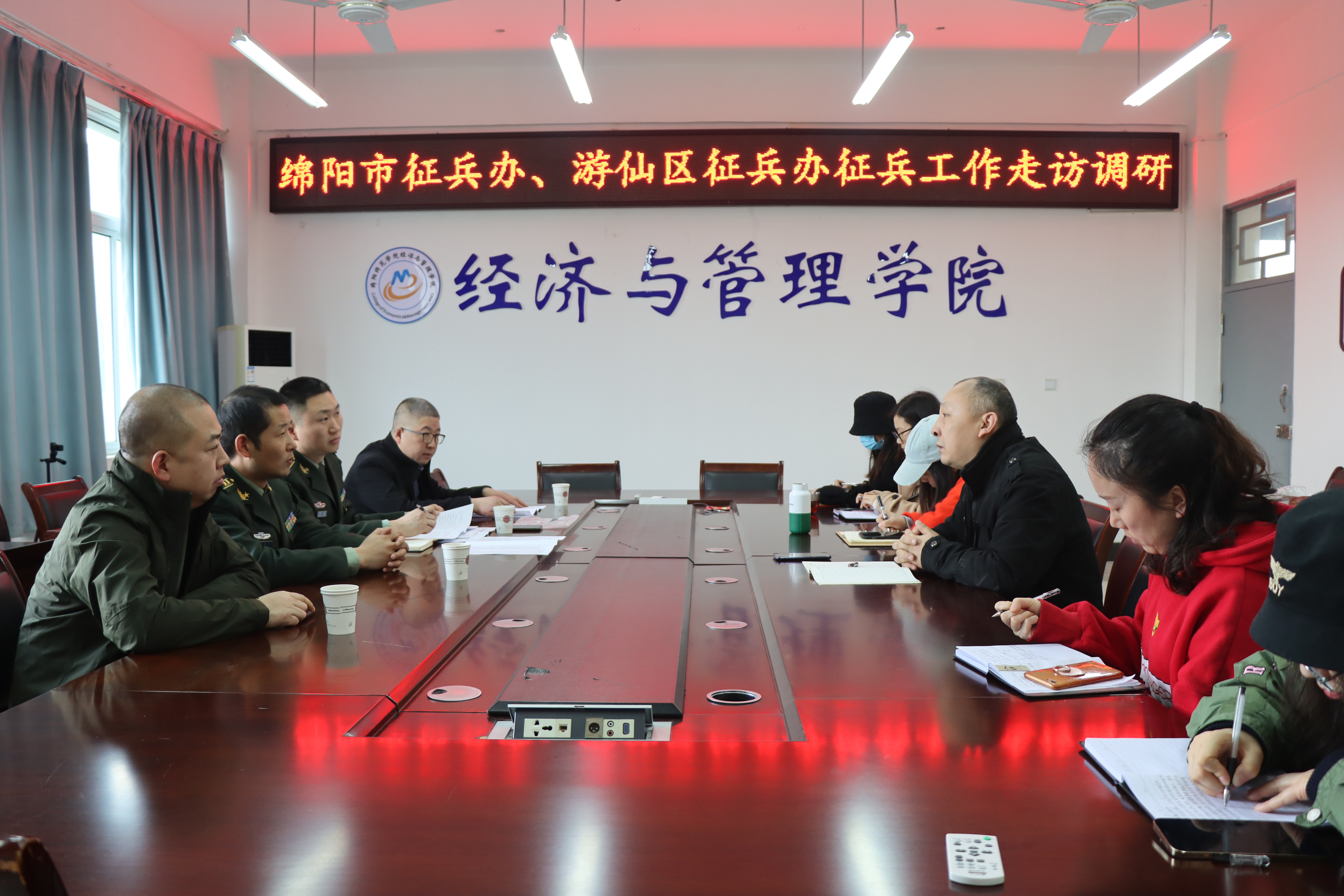 3月26日,市征兵办、游仙区武装部来我校走访调研大学生征兵工作。调研以座谈会的形式展开,随机选取学校经济管理学院作为二级学院代表参加座谈。学校武装部负责人,经管学院分管征兵工作负责人和全体辅导员参会。