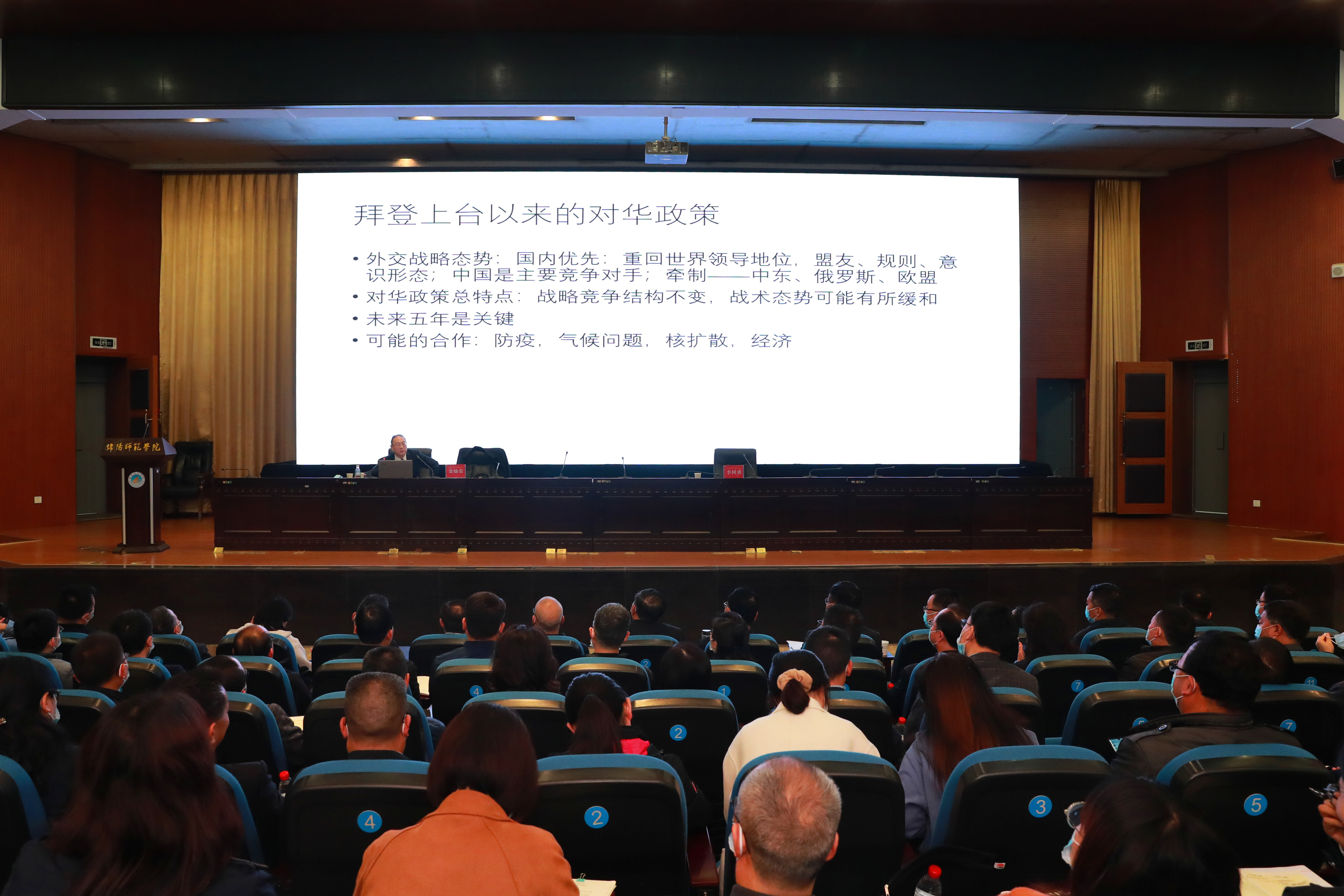 大会邀请了中国人民大学国际关系学院教授、教育部长江学者特聘教授、中国未来研究会理事长金灿荣,作了题为《全球新态势与中美关系—中国的机遇与挑战》主旨报告,报告由校长李树勇教授主持。金灿荣围绕“百年未有之大变局”主题,通过历史纵向和中外横向比较,阐述了百年变局中“新的国际格局、新的现代化模式、新的工业革命和新的全球治理”这四个“新”,以及中国在经济、政治、军事、外交等领域面临的机遇和挑战。报告重点围绕“中美关系”和“美国大选”议题,解读了后疫情时代中美关系的未来走向,展望了中华民族伟大复兴的前景。报告主题鲜明、视野开阔、理论深刻、事例鲜活,赢得全场师生阵阵掌声,给大家带来了一场有深度、有高度、有广度、有温度的学术“大餐”。