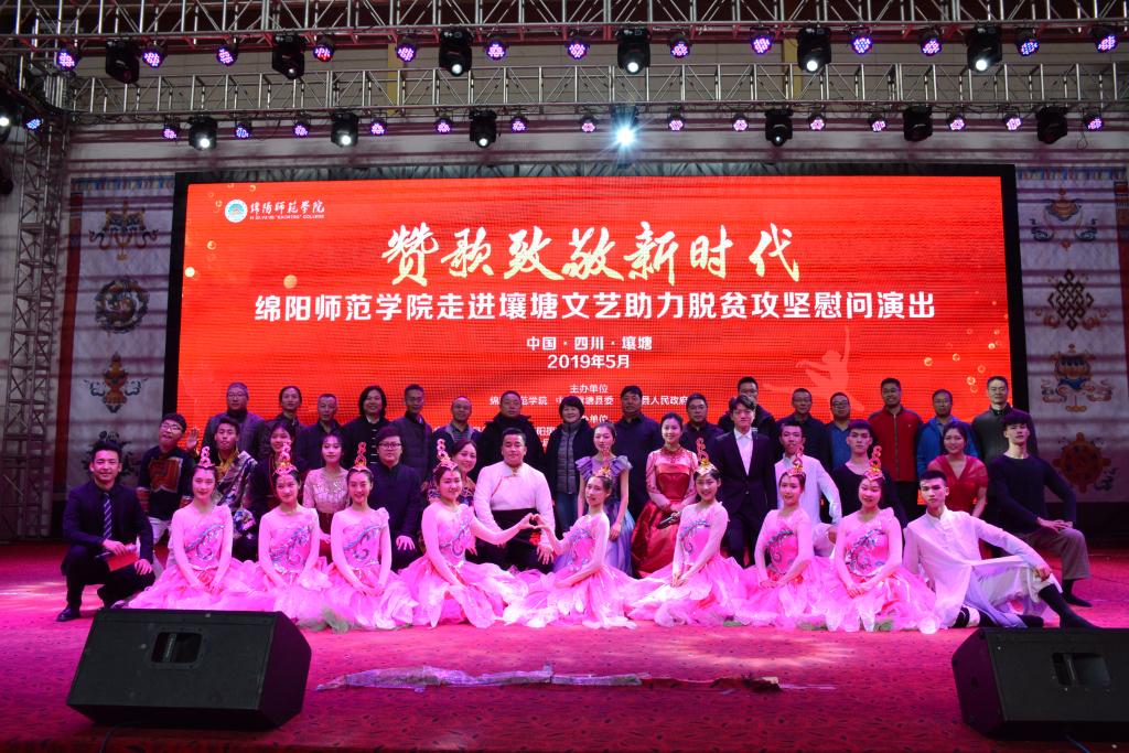 脱贫攻坚任务重,慰问演出情谊浓;感恩奋进新时代,携手共圆小康梦。5月28日,学校走进壤塘文艺助力脱贫攻坚慰问演出《赞歌致敬新时代》首演在阿坝州壤塘县体育馆举行。阿坝州副州长、壤塘县委书记严华,壤塘县四大班子和县级各部门干部职工,学校党委副书记、纪委书记王琪,党委常委、副校长陈寒,县寄宿制小学全体师生及壤塘各族群众1500余人一起观看演出,共同吹响脱贫攻坚新的奋进号角,用最喜悦、最欢快的方式庆祝新中国成立70周年。