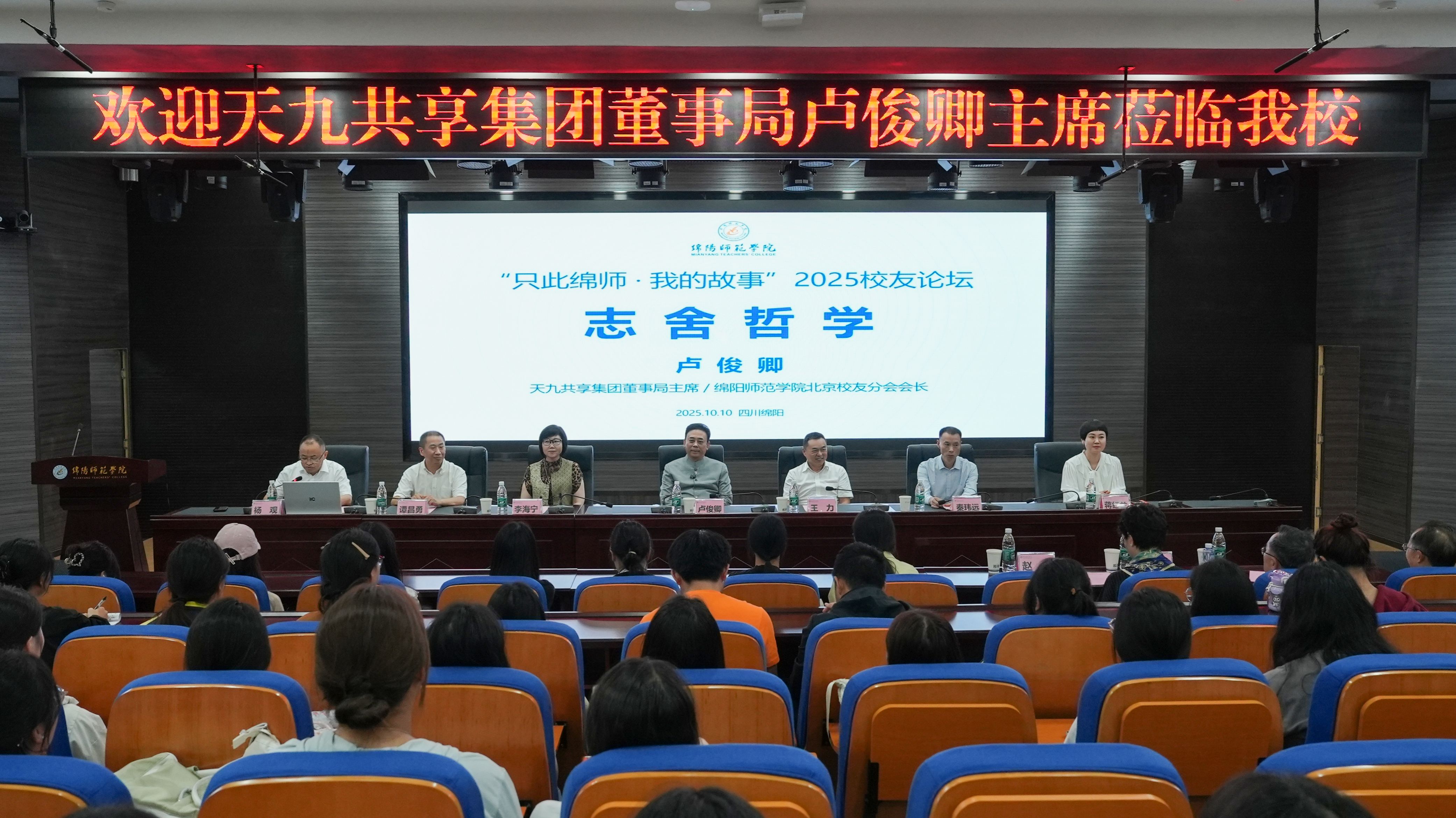 10月10日,由对外合作处、校友办公室主办,文学院承办,数字经济与管理学院、历史文化与旅游学院、人工智能学院协办的“只此绵师·我的故事”校友论坛在厚德楼246学术报告厅举行。本次论坛特邀中文系1982级杰出校友、天九共享集团董事局主席卢俊卿博士重返母校,以“志舍哲学”为主题进行专题分享。学校党委常委、副校长王力出席活动,对外合作处、校友办公室、文学院及数字经济与管理学院相关负责人,文学院老领导、老教师以及全校300余名师生代表共同聆听了讲座。文学院院长杨观教授主持本次活动。