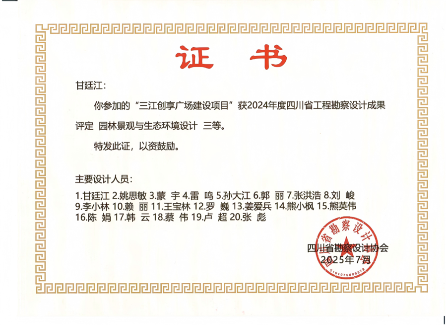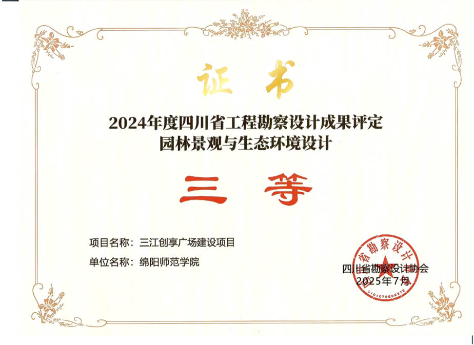近日,2024年度四川省工程勘察设计成果评定揭晓,由学校作为第一单位、四川远通规划设计有限公司(学校实习基地)协同申报的“三江创享广场项目”荣获三等奖,该项目由人居环境学院的甘廷江老师主持。