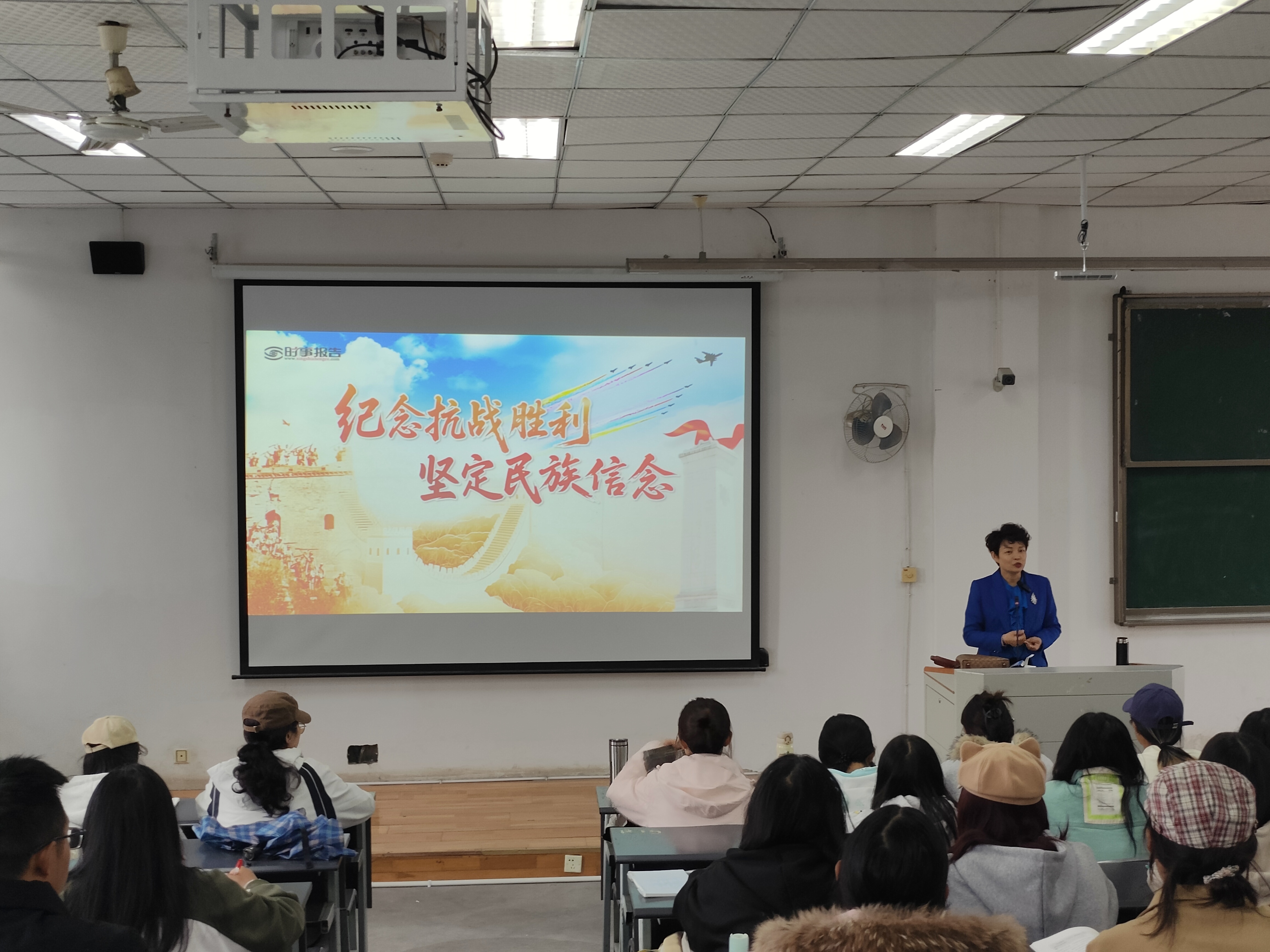 授课中,罗娅君还围绕“伟大抗战精神”的内涵展开讲解,从“天下兴亡、匹夫有责的爱国情怀”“视死如归、宁死不屈的民族气节”“不畏强暴、血战到底的英雄气概”“百折不挠、坚忍不拔的必胜信念”四个维度,结合杨靖宇、赵一曼、狼牙山五壮士等英雄人物事迹,让学生直观感受抗战精神的时代价值。她指出,抗战胜利不仅洗刷了近代中国抗击外来侵略屡战屡败的耻辱,更重新确立了中国的世界大国地位,为中华民族伟大复兴开辟了光明前景。当下传承抗战精神,就是要将个人理想融入国家发展,在复杂国际环境中坚守民族信念、维护国家尊严。