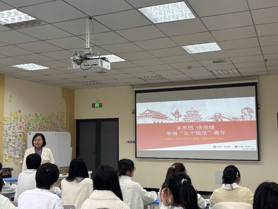 开班仪式后,心理与社会学院书记王海榕为大家带来了一场主题为“学思想悟原理,争做五个模范青年”的理论培训课程。深入浅出地讲解了相关理论知识,引导大家深刻理解思想内涵与基本原理,并鼓励青年同志们积极践行“五个模范”的要求,努力提升自身的思想觉悟与实践能力。整个课程内容丰富、逻辑清晰,为大家今后的学习与成长提供了宝贵的指导与启发。