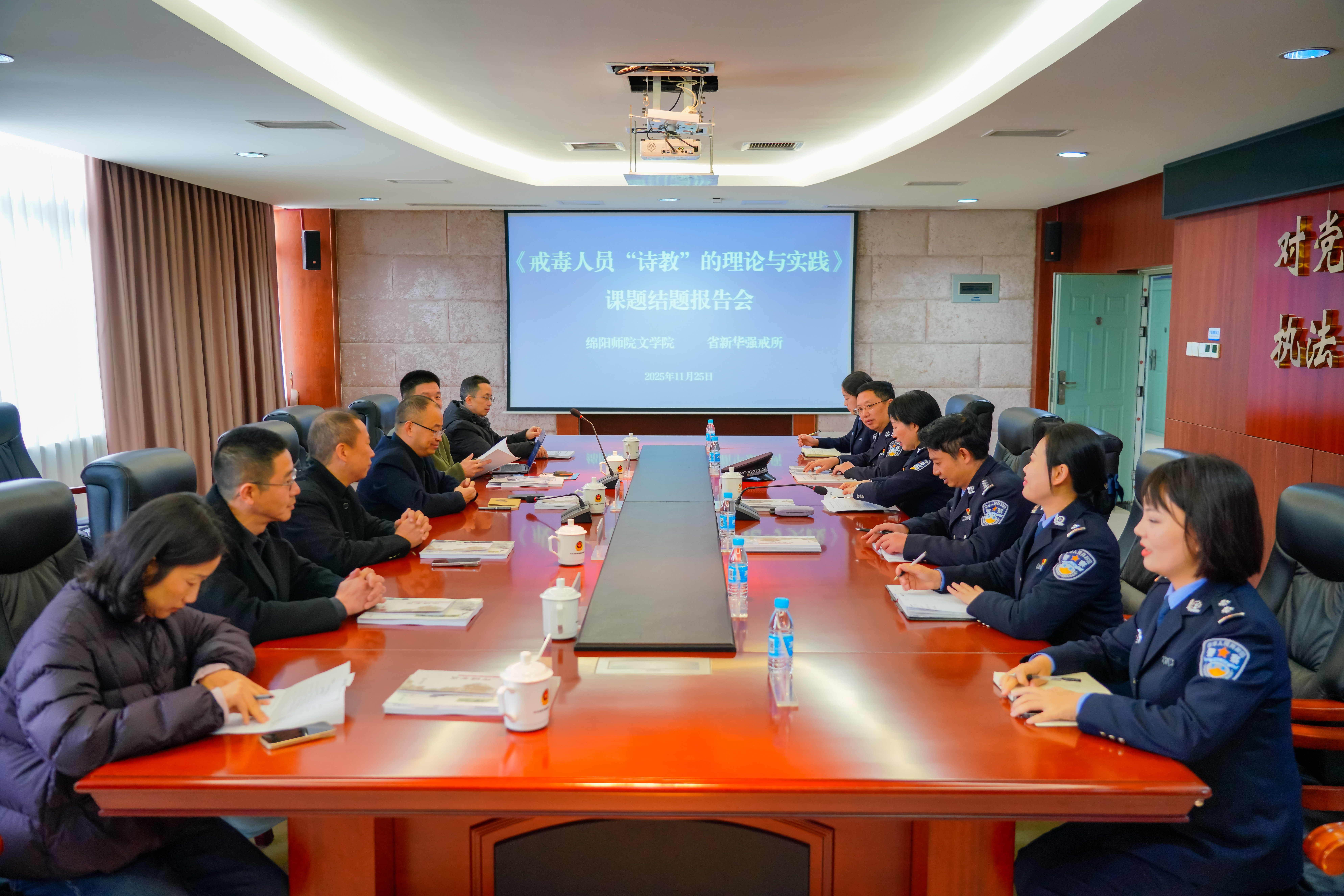 11月25日,学校文学院与四川省新华强制隔离戒毒所(以下简称“新华强戒所”)合作的《戒毒人员“诗教”理论与实践》项目结题活动在新华强戒所举行。文学院负责人及相关人员一行6人与新华强戒所党委书记、所长马宁,干警代表、戒毒人员等近百人参加活动。此次结项活动标志着双方在探索以文化人、以美育心的戒毒康复新路径上取得了阶段性重要成果。