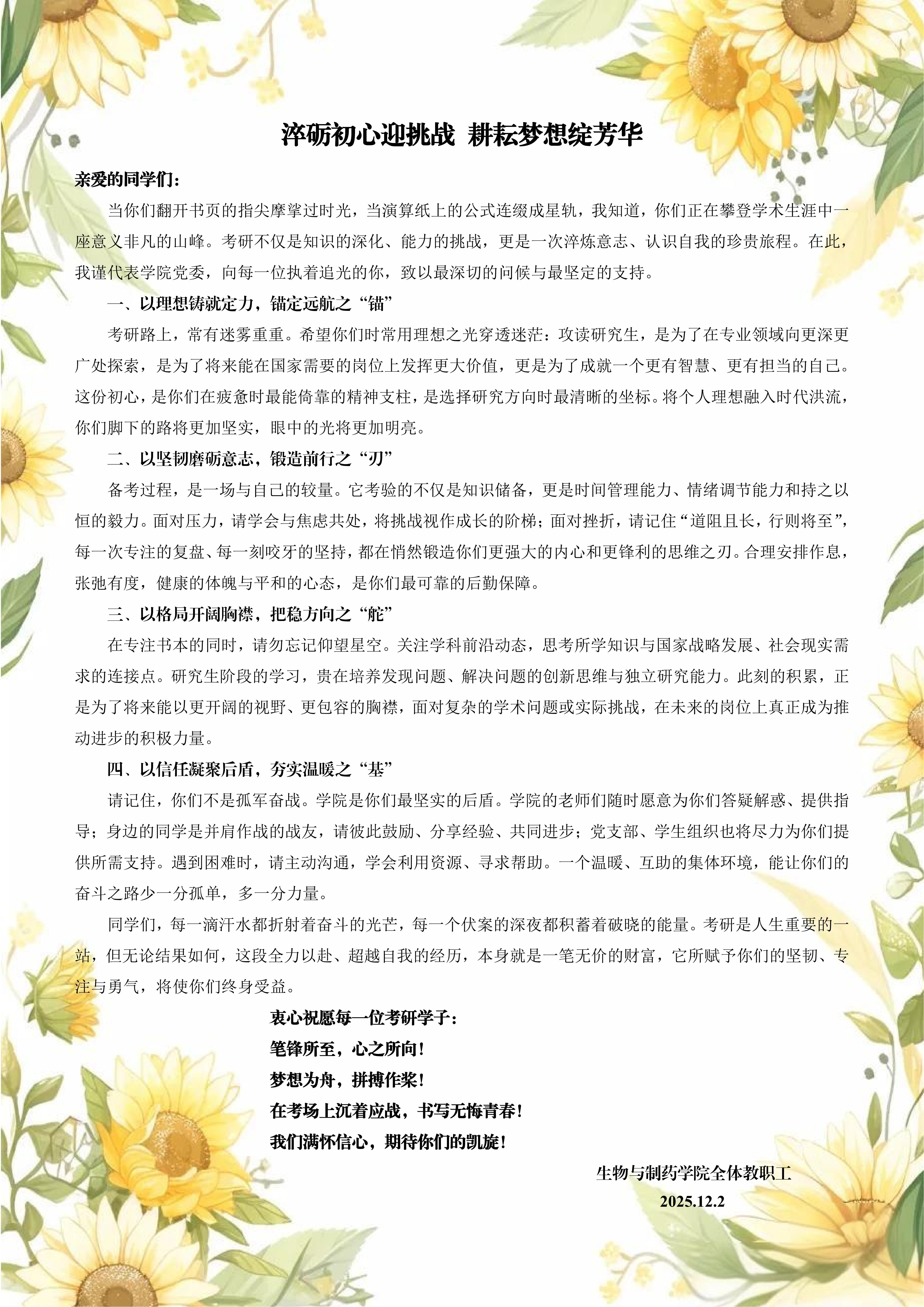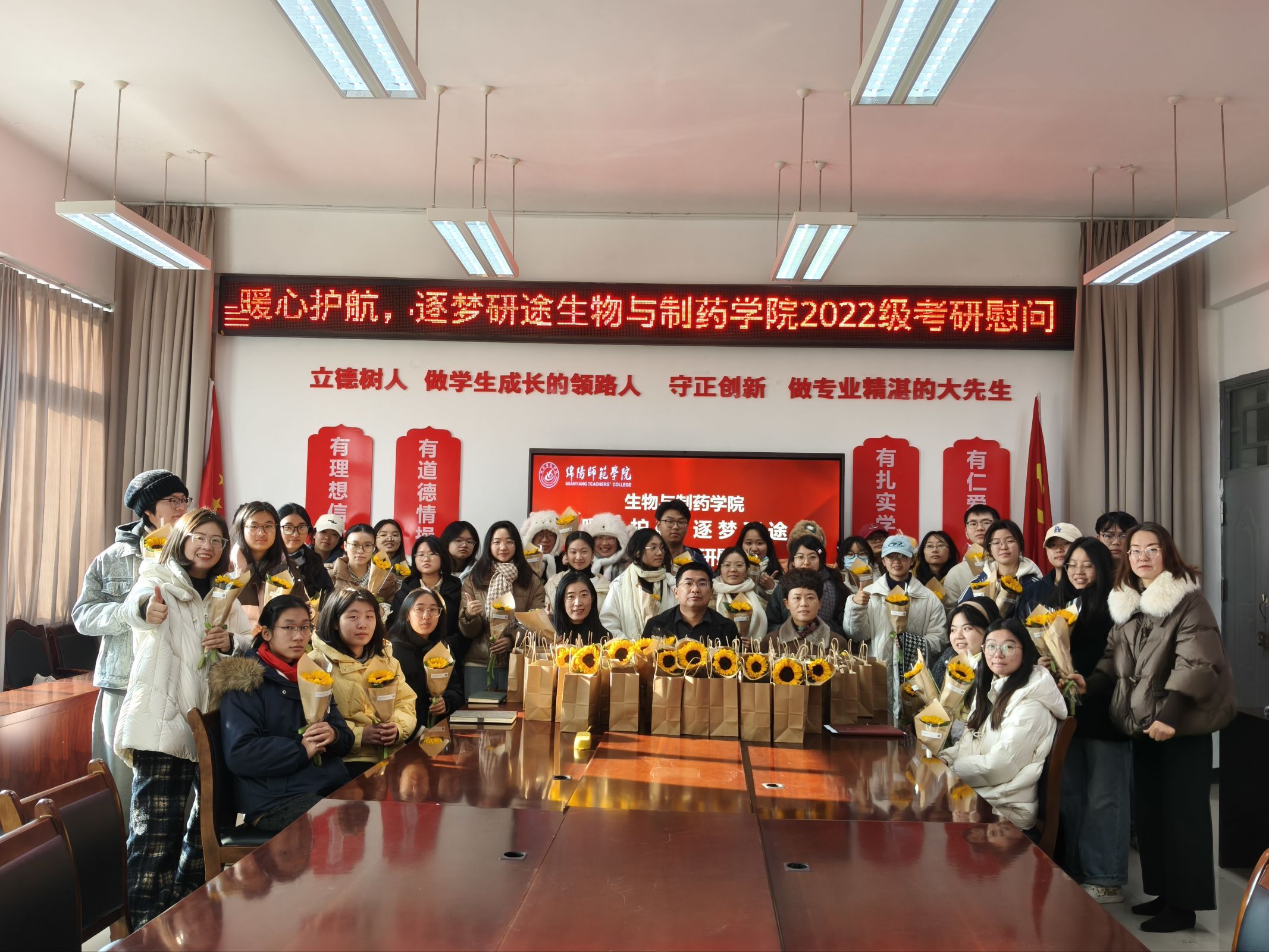 学院负责人代表学院寄语学子,勉励大家以理想锚定方向,将个人追求融入时代发展;以坚韧应对挑战,学会正视压力、持续复盘;以格局开拓视野,衔接学科前沿与社会需求;以信任凝聚力量,善用学院资源、加强同辈互助。他强调,考研历程本身就是成长的宝贵财富。学院相关负责人鼓励学子:“考题虽难,人人皆同,自信即底气。”学院还为每位学子准备了寓意“一举夺魁”的向日葵及暖心零食礼包,满载学院的牵挂与祝福。师生共同手持向日葵合影,现场温馨洋溢,期许与鼓舞交织。