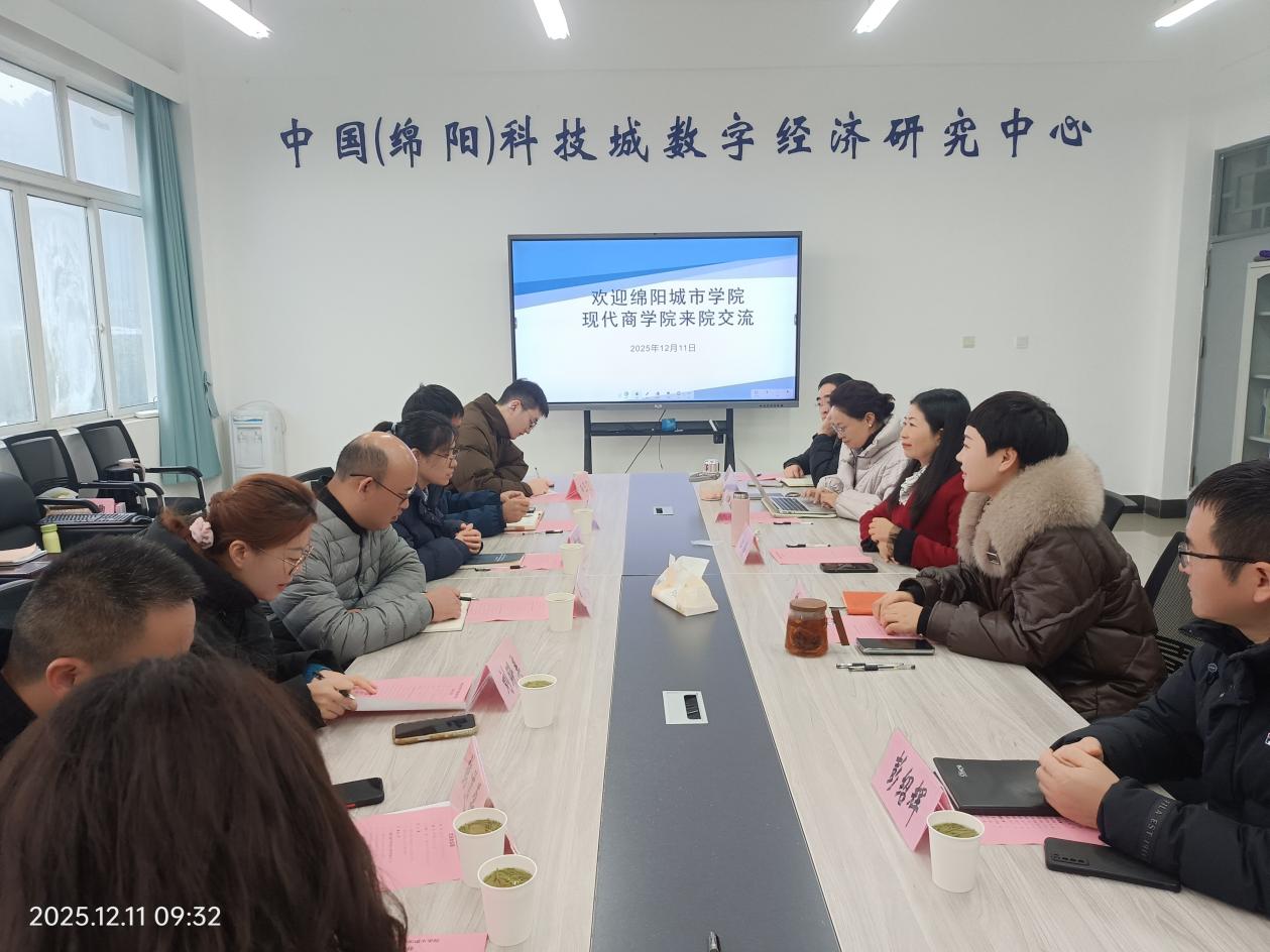 12月11日上午,绵阳城市学院现代商学院院长邹江、院长助理杨林等一行八人来访我院,开展考察交流活动。数字经济与管理学院负责人、数字经济专业负责人及实验室主任等参加座谈。