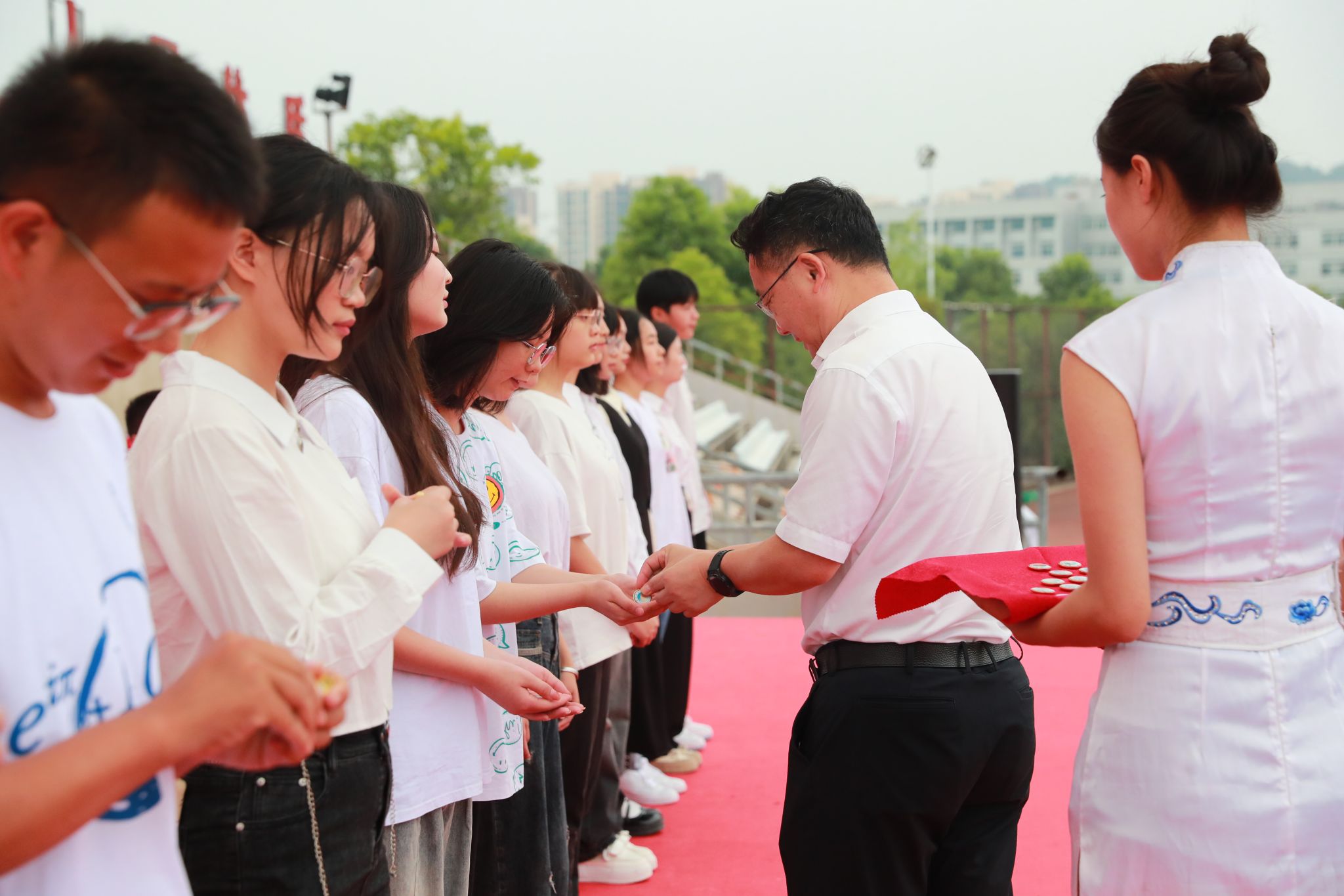 在师长和同窗的见证下,李树勇书记和陈寒校长为2023级新生代表佩戴校徽。戴在胸前的校徽熠熠闪光,承载着“自强不息、艰苦奋斗、务实创新、追求卓越”的绵师精神。2023级学子从此拥有绵师人的身份标识,共享绵师人的荣耀,共担绵师人的使命。