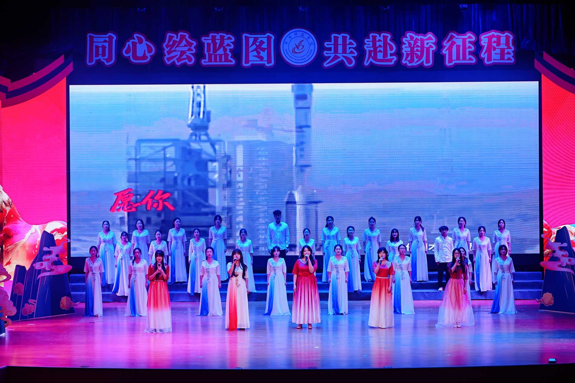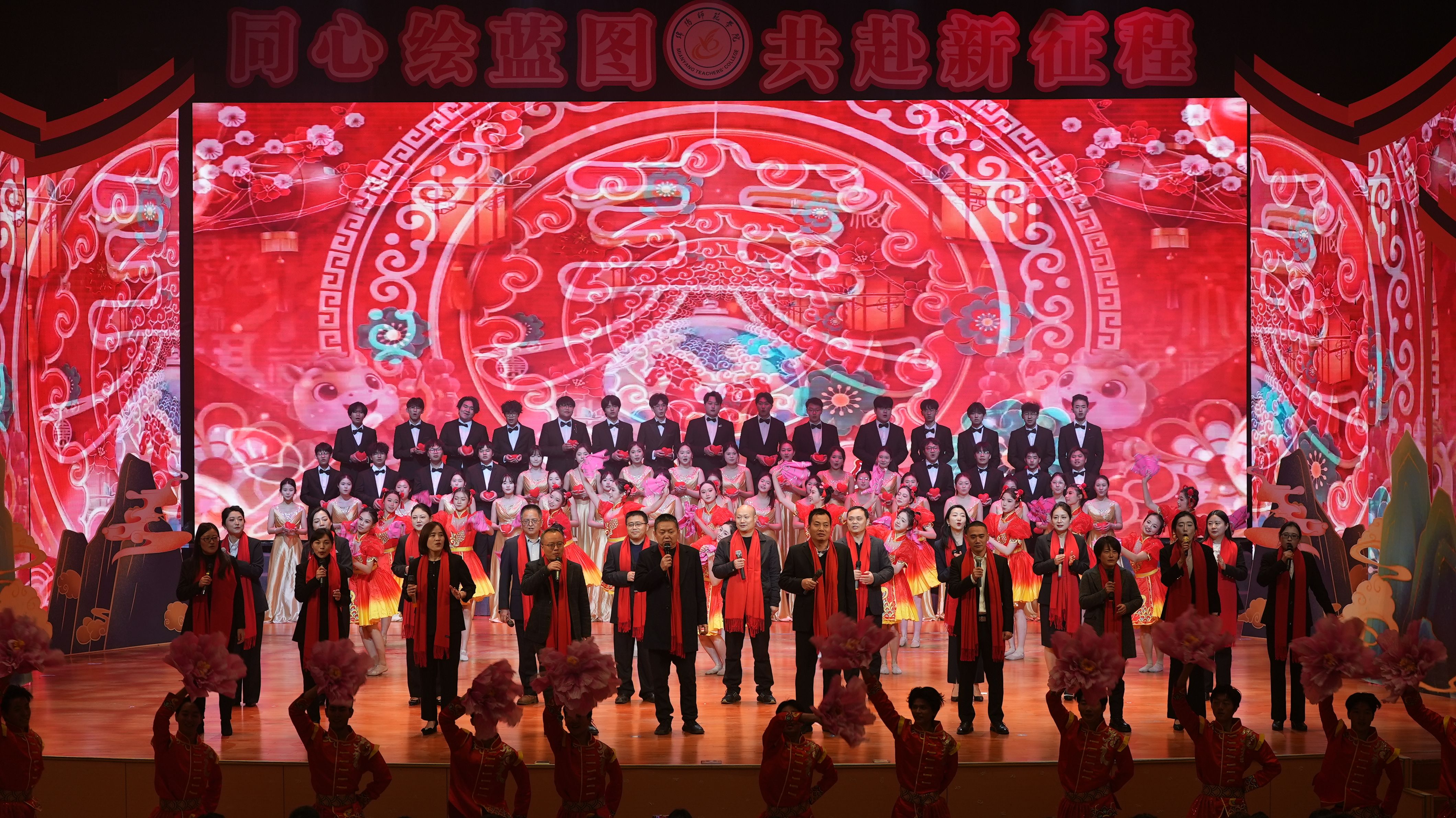 晚会在《盛世欢歌》中落下帷幕,校领导、留学生代表与全体演职人员登台,歌声与掌声交织成欢乐的海洋。新的一年,全体绵师人将以更饱满的热情砥砺前行,共同书写学校高质量发展的新篇章。