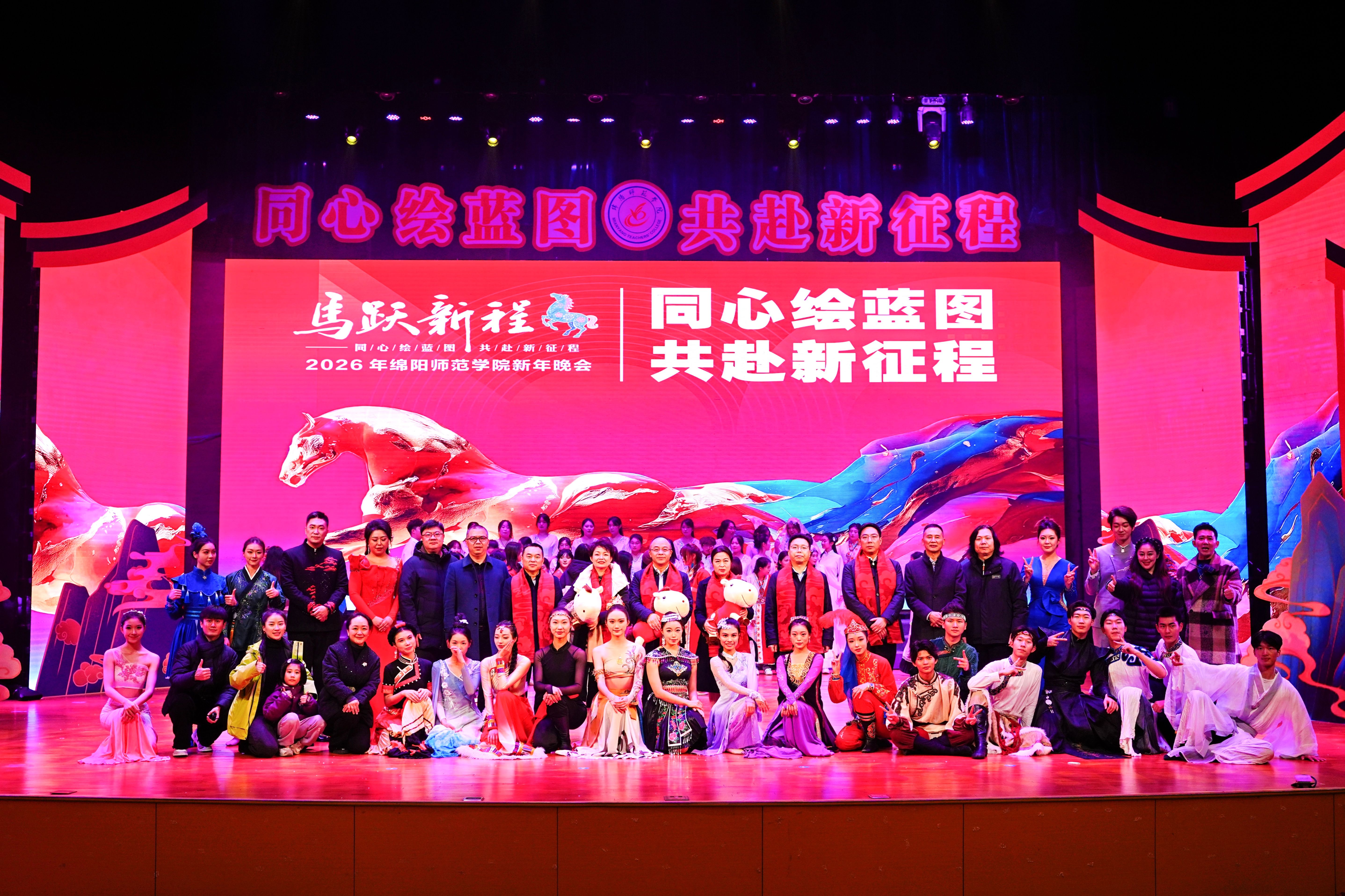 12月30日晚,高新校区行知音乐厅灯火璀璨、人声鼎沸,“同心绘蓝图 共赴新征程”绵阳师范学院2026年新年晚会温情启幕。全体校领导、离退休老同志代表与500余名师生代表欢聚一堂,用一场精彩纷呈的文艺盛宴辞旧迎新,共度新春。
