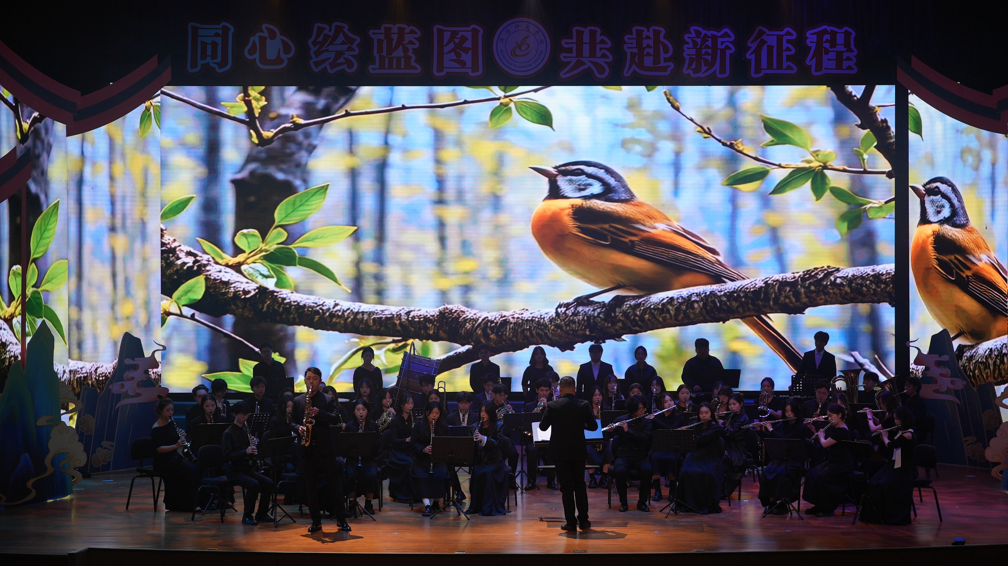 交响乐《春之诗》以浑厚悠扬的旋律让观众徜徉于春日的盎然生机中。《诗中绵师情画里中国年》成为晚会一大亮点。校领导们深情朗诵《诗咏绵师》,回望2025硕果盈枝的奋斗征程,锚定“十五五”规划新起点,字字铿锵间,“升大”的目标愈发清晰,区域一流应用型大学蓝图徐徐展开,“强校有我”的铮铮誓言响彻全场,传递出绵师人以梦想为舟、以实干为帆,凝心聚力为民族复兴贡献智慧与力量的坚定信念。