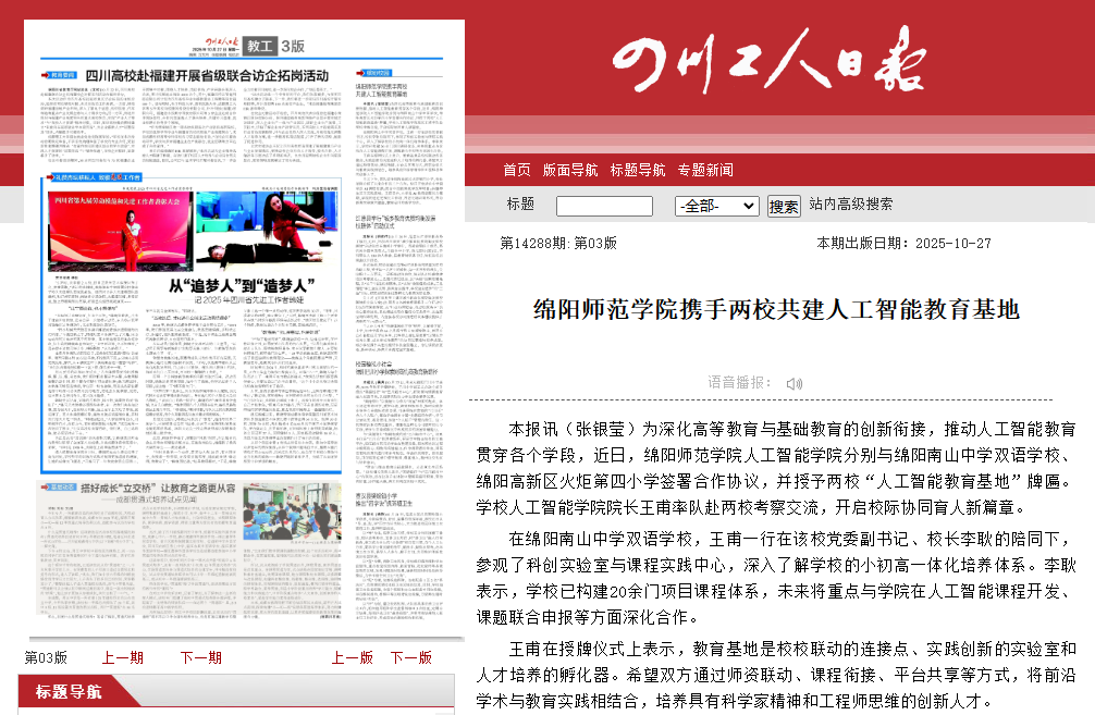 为深化高等教育与基础教育的创新衔接,推动人工智能教育贯穿各个学段,近日,绵阳师范学院人工智能学院分别与绵阳南山中学双语学校、绵阳高新区火炬第四小学签署合作协议,并授予两校“人工智能教育基地”牌匾。学校人工智能学院院长王甫率队赴两校考察交流,开启校际协同育人新篇章。