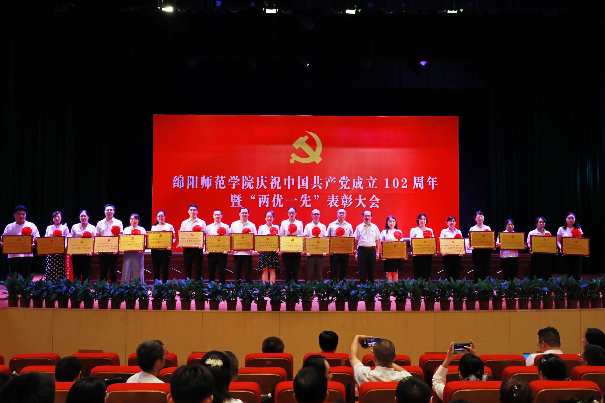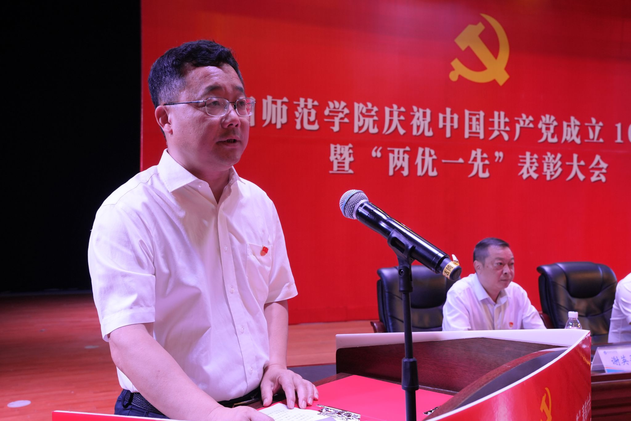 党委副书记、校长陈寒宣读“两优一先”表彰决定。校领导依次为先进基层党组织、优秀共产党员代表、优秀党务工作者颁奖。先进基层党组织书记代表、教育科学学院党委书记王海榕,优秀共产党员代表、资源环境工程学院教师贾俊作交流发言。