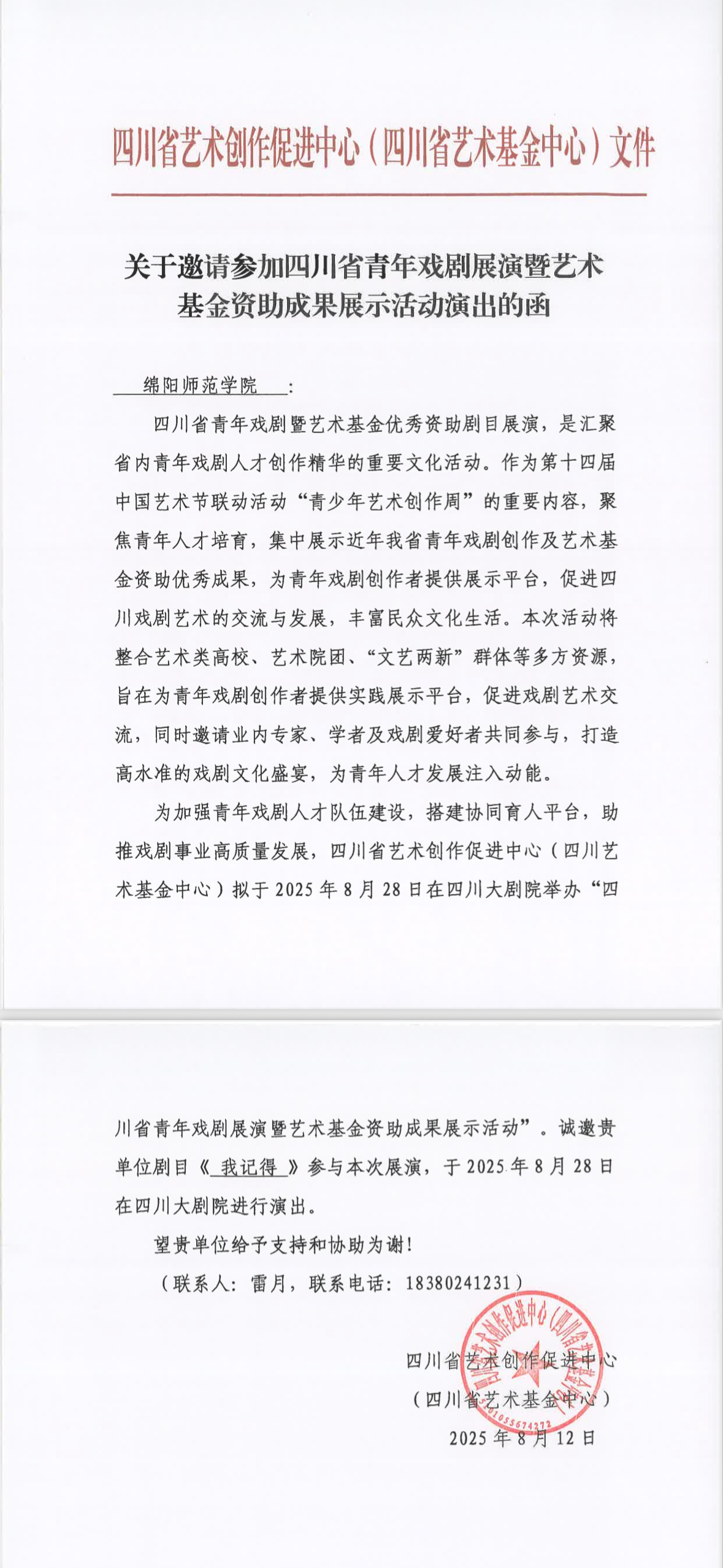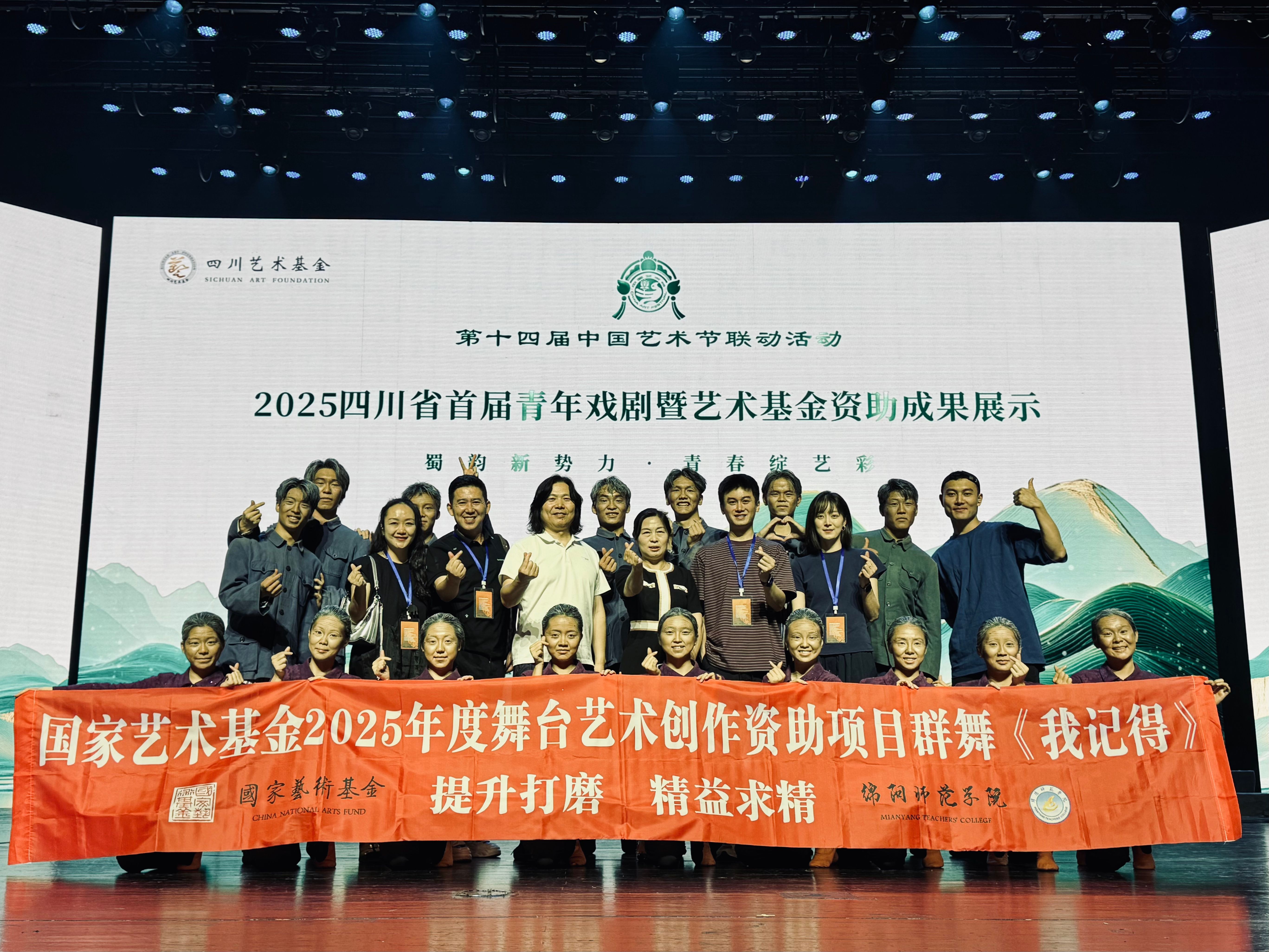 为促进青年戏剧与舞台艺术发展、集中展示艺术基金资助成果,8月28日晚,由文化和旅游部艺术司与四川省文化和旅游厅联合主办,四川省艺术创作促进中心(四川省艺术基金中心)承办的“第十四届中国艺术节联动活动——2025四川省首届青年戏剧暨艺术基金资助成果展示”在四川大剧院举行,本次展演以“蜀韵新势力・青春绽艺彩”为主题,汇聚了省内青年戏剧人才的创作成果。我校国家艺术基金资助群舞作品《我记得》作为全省唯一的舞蹈类节目受邀参演,并于当晚精彩亮相。学校党委副书记、校长李敏受邀观看演出并慰问参演师生。