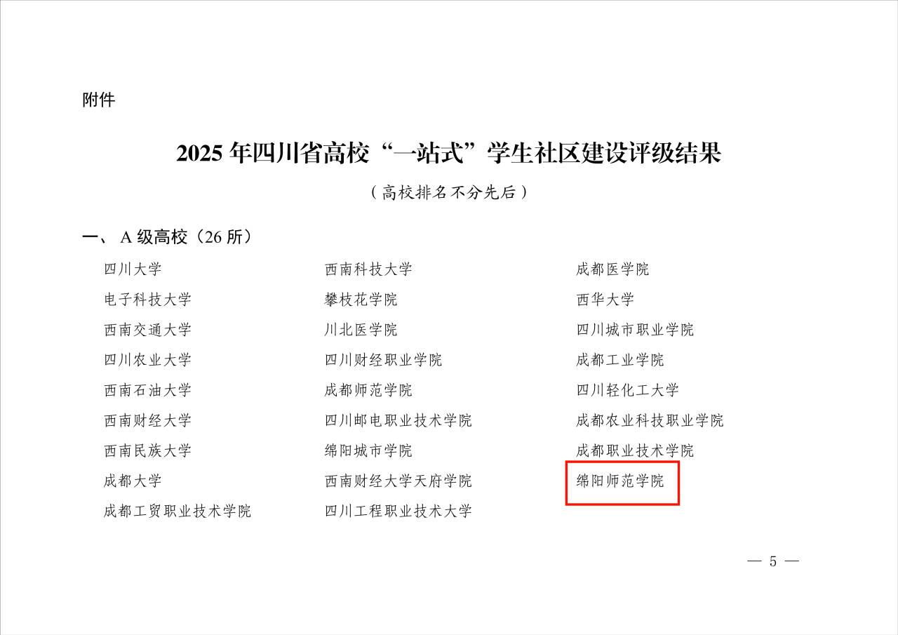 10月28日,中共四川省委教育工委公布2025年全省高校“一站式”学生社区建设评级结果,经学校自评、专家评审、省教育厅审定等程序,学校获评A级高校,并因“一站式”学生社区建设推进情况较好、育人要素齐全、建设成效显著,受到通报表扬。