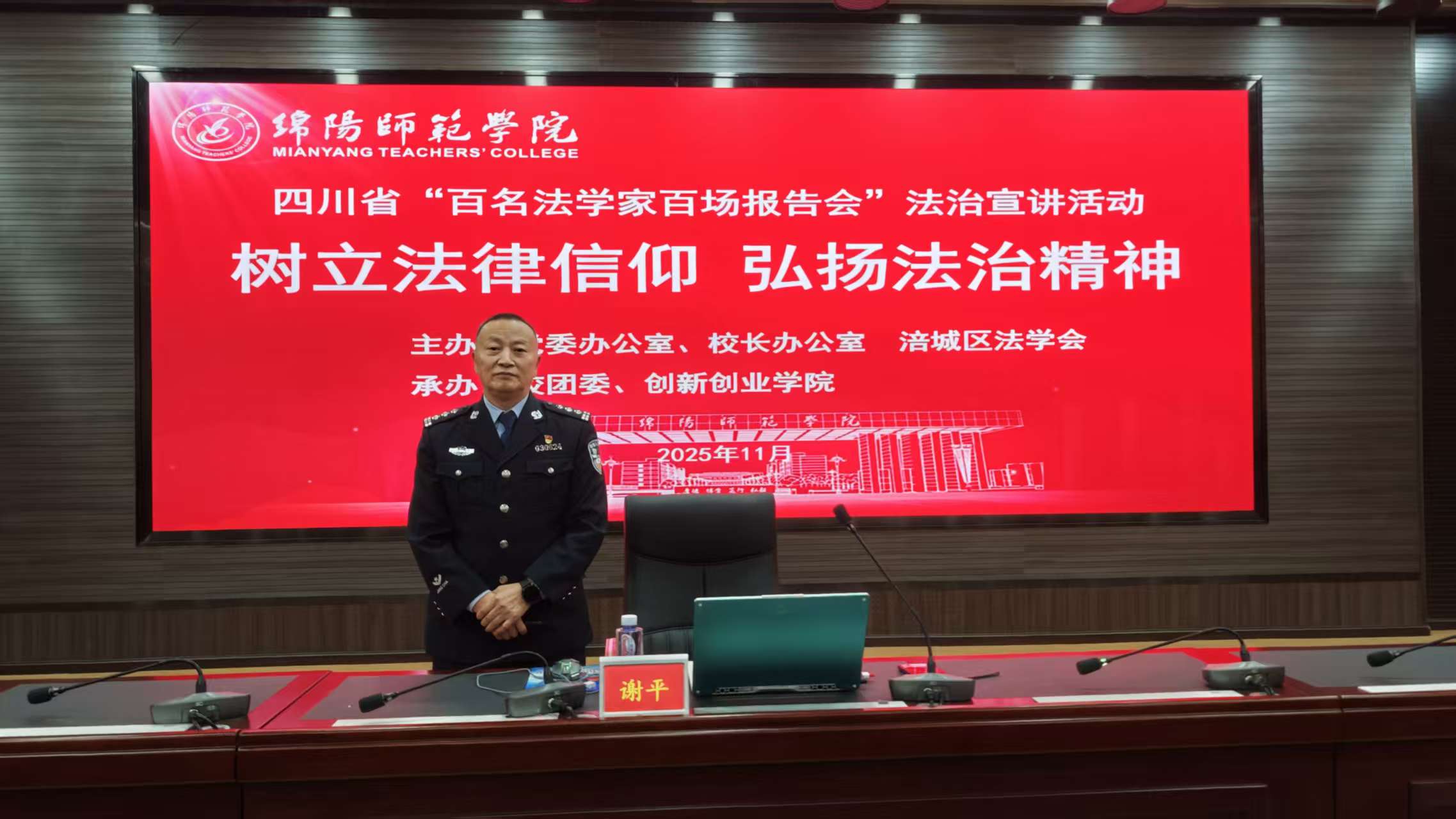 按照四川省2025年“百名法学家百场报告会”法治宣讲活动要求,11月6日,学校特邀绵阳市公安局涪城区分局二级警长谢平同志来校开展法治宣讲活动。活动在高新校区厚德楼246室开展,200余名学生代表参加。