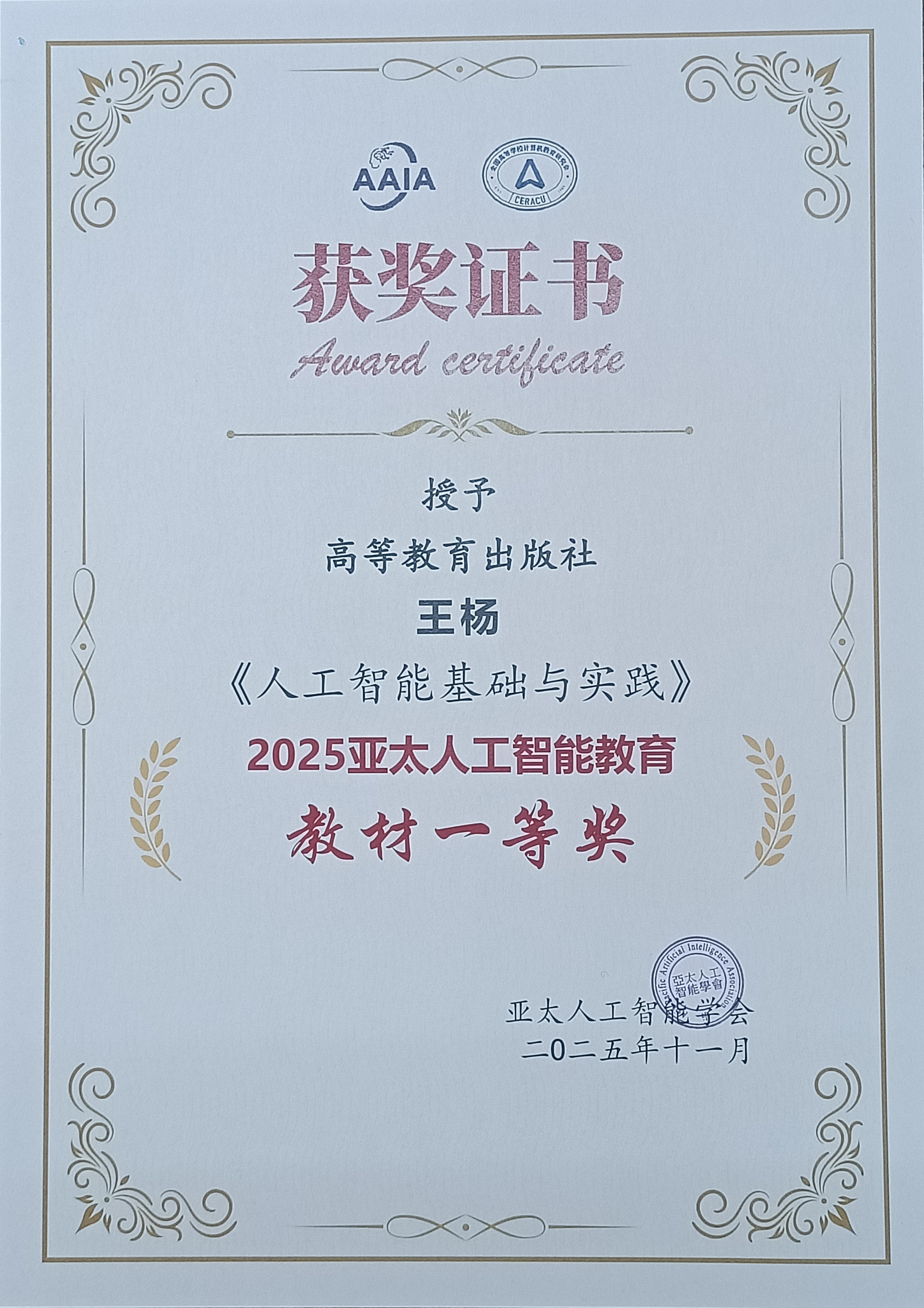 11月22日,学校副校长王杨编写的教材《人工智能基础与实践》在杭州举办的“2025 新时代高校计算机教学改革与创新交流会・高校人工智能教育教学创新协作机制年会”上,作为国家教材建设重点研究基地(高等学校人工智能教材研究)重点成果,入选高等学校人工智能通识教育系列教材并参与发布仪式;在福州召开的“2025亚太人工智能教育大会”颁奖典礼上,该教材凭借优质的内容编排与实践价值,获评“2025亚太人工智能教育教材一等奖”。