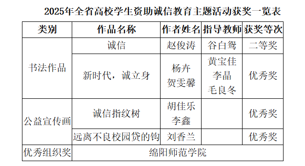 近日,由四川省教育厅、中国人民银行四川省分行联合主办的2025年高校学生资助诚信教育宣传作品评选结果正式公布,学校报送的4件作品成功获奖。其中,《诚信》获书法作品二等奖,《新时代,诚立身》获书法作品优秀奖,《诚信指纹树》《远离不良校园贷的钩》获公益宣传画优秀奖,学校荣获“优秀组织奖”。