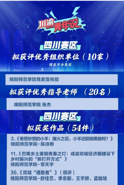 此次在“川渝青年说”大赛中的优异表现,既是学校网络思政育人成果的集中彰显,更是对师生扎根现实土壤、深耕创作、勇担时代使命的有力激励。学校将继续搭建优质平台,持续鼓励师生创作更多有内涵、有温度、有影响力的网络作品,用心用情讲述好绵师故事、中国故事,为强国建设注入更多青春正能量。