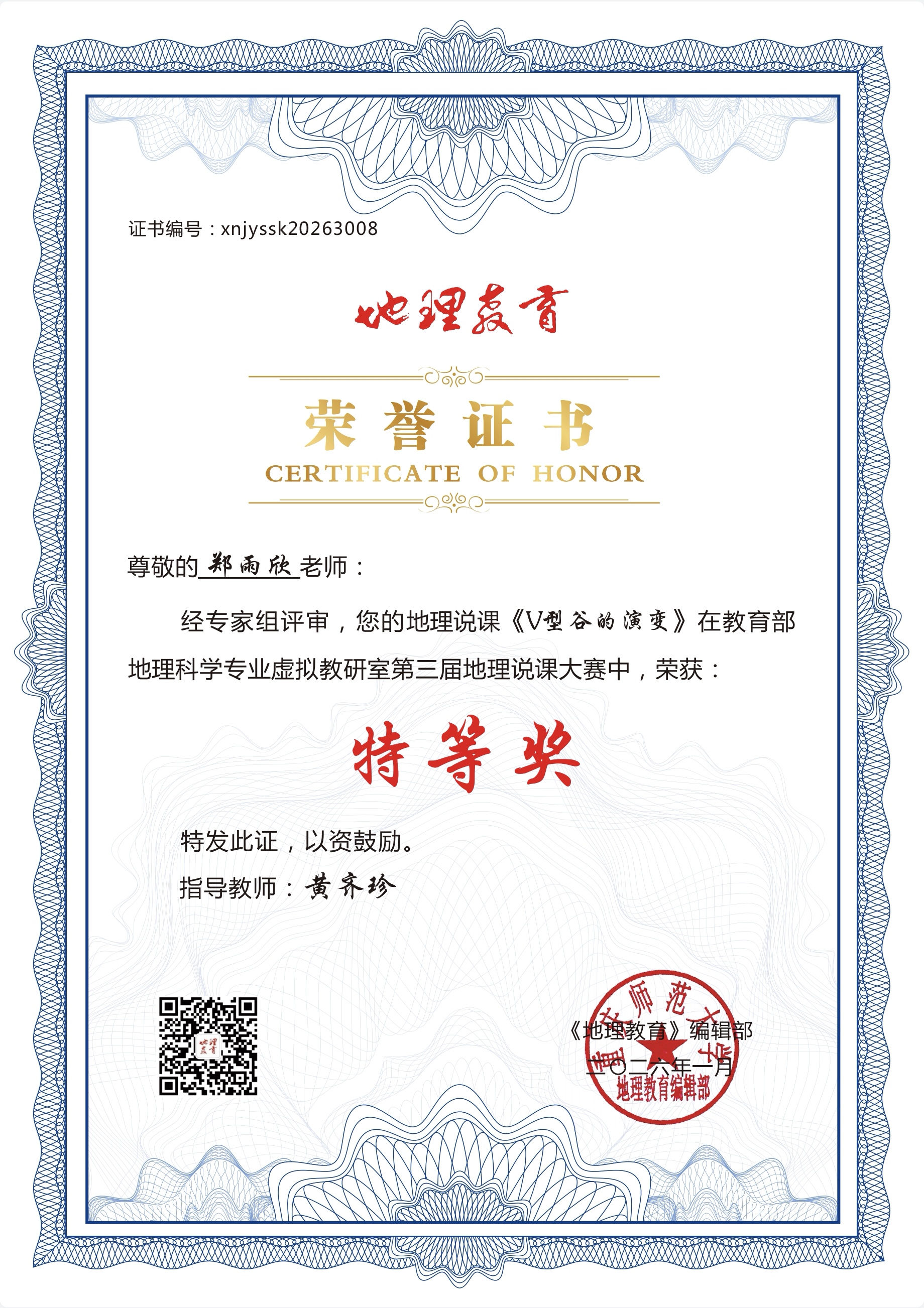 在本次赛事中,郑雨欣同学的说课作品《V型谷的演变》、杨雨亭同学的说课作品《河谷的演变》,凭借新颖的教学设计、清晰的逻辑架构与生动的课堂呈现,从海量参赛作品中脱颖而出,双双斩获特等奖;李金帅同学的说课作品《海陆的变迁》凭借扎实的专业功底与出色的教学表达,荣获一等奖。三项荣誉的取得,离不开黄齐珍老师的悉心指导,更凝聚着参赛同学的不懈打磨与专业积累。