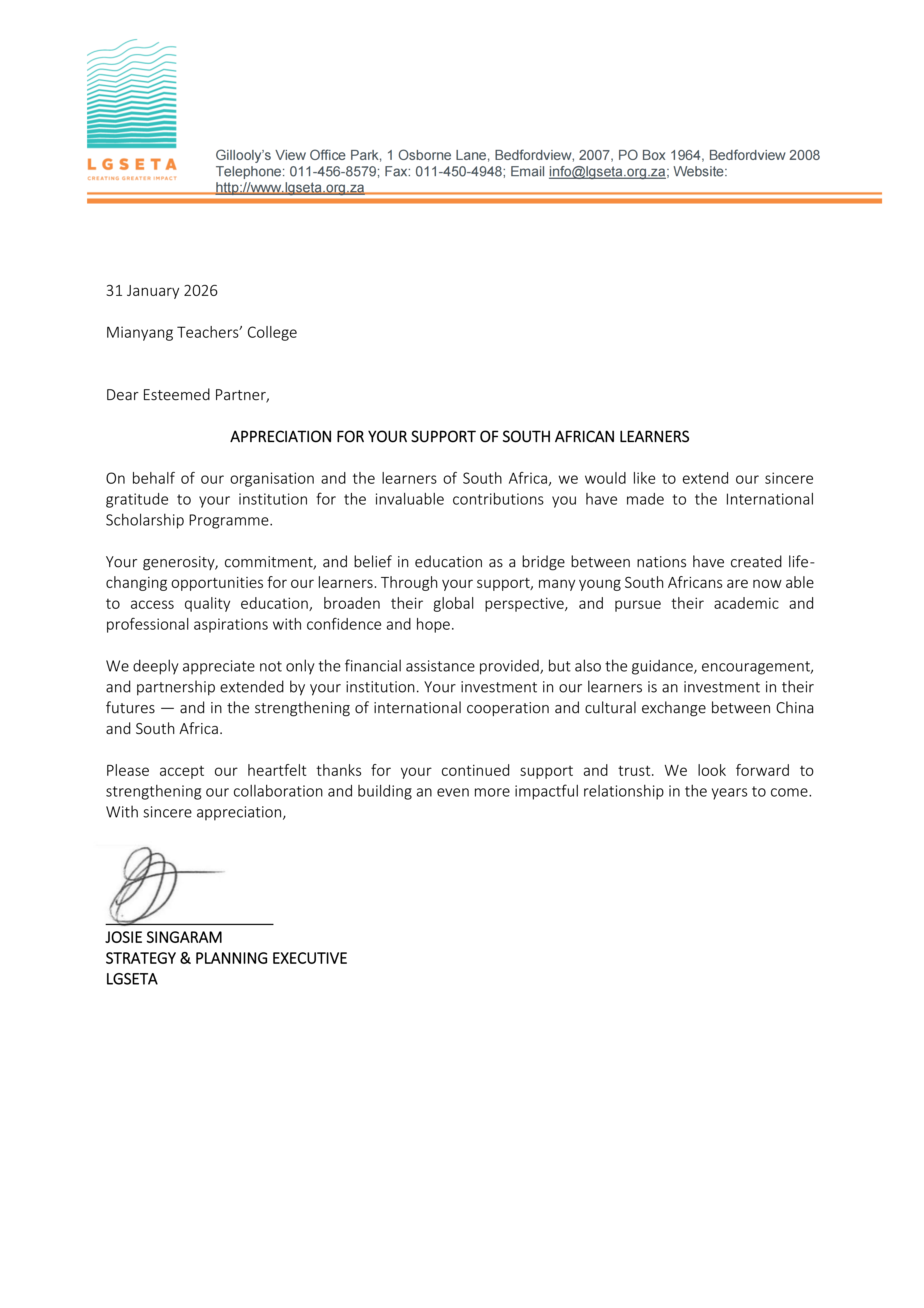 近日,学校收到南非LGSETA战略与规划执行主管乔西·辛加拉姆女士发来的感谢信,对学校在2025级南非学历生委培项目(国际奖学金项目)中的支持与合作致以诚挚谢意。