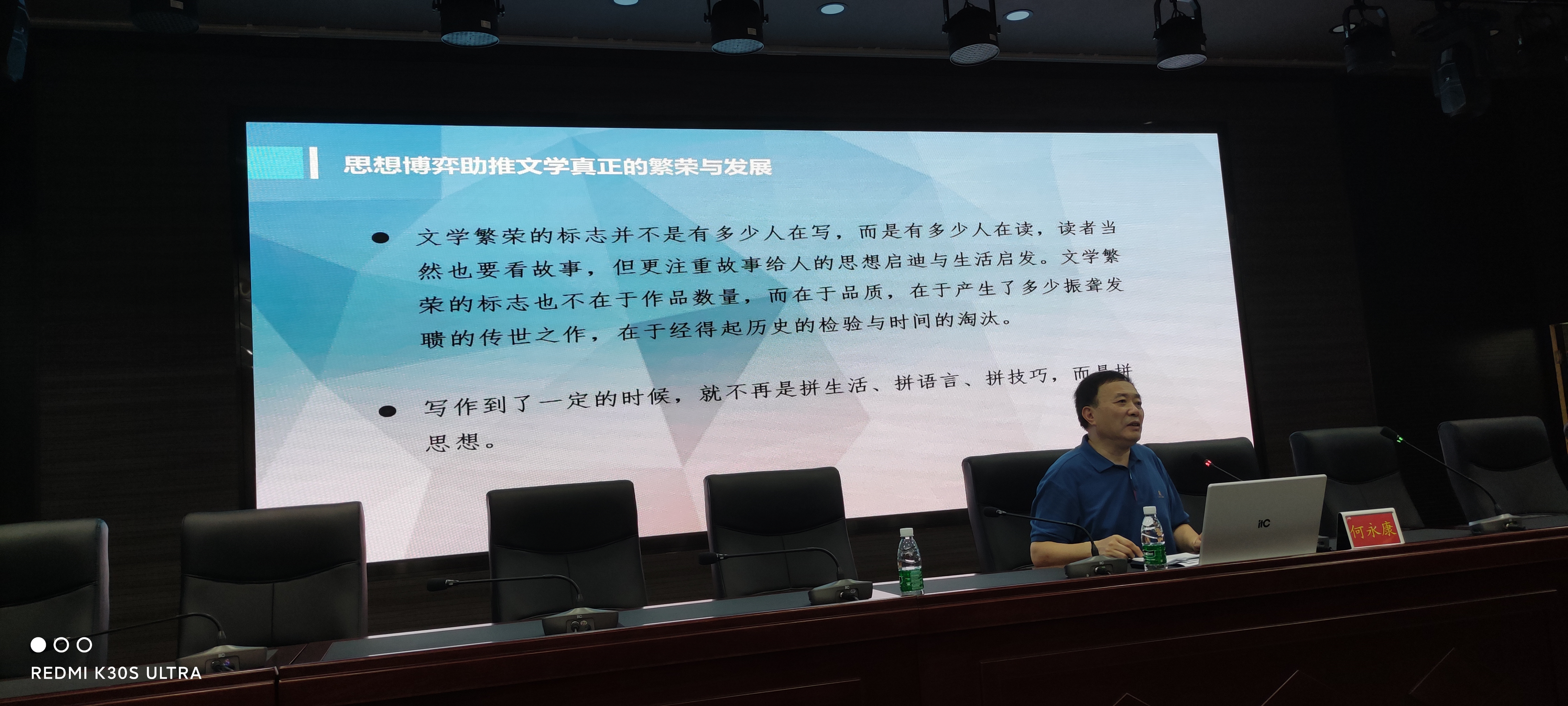 何永康先生与同学们进行了积极的互动,向同学讲授了创作心路历程以文学评奖的核心要素,就思想性在文学中的骨肉与灵魂、文学创作思想博弈过程、文学在思想中生存博弈中发展、新媒体时代文学与新闻之关系等几个方面作了深入浅出的讲解。现场气氛热烈,掌声不断。